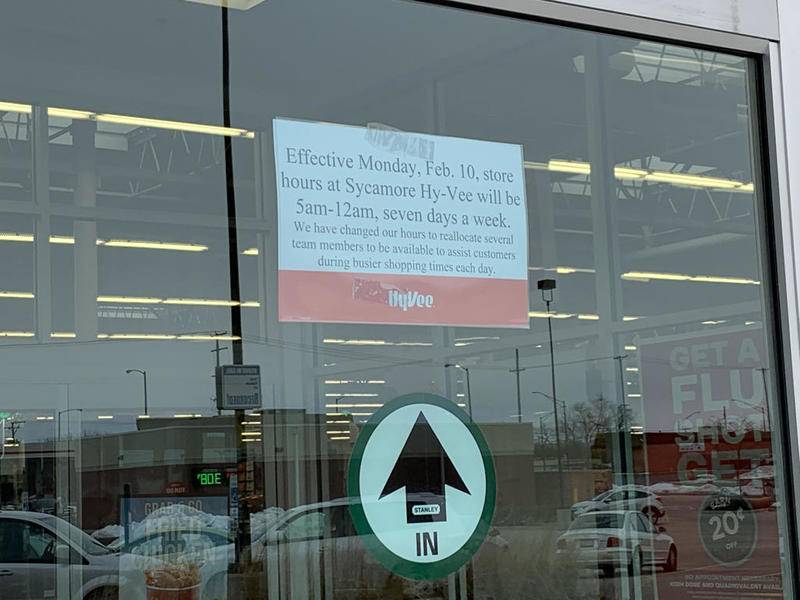 A sign at the entrance to the Sycamore Hy-Vee, 2700 Oakland Dr., Tuesday alerted customers to the new hours.