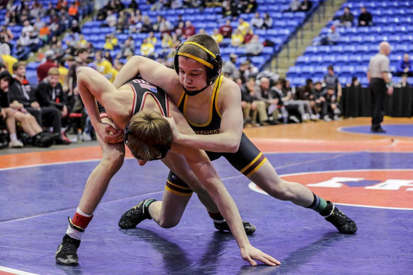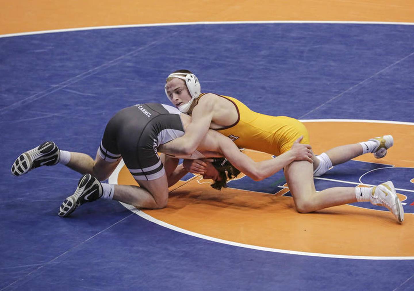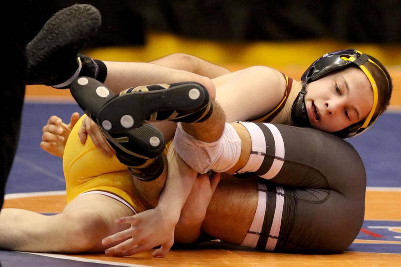 Montini's Brayden Thompson wrestles Mount Carmel's Ashton Breen on Saturday, Feb. 29, 2020, during the IHSA Dual Team Wrestling Championship at Grossinger Motors Arena in Bloomington, Ill. (Eric Ginnard)