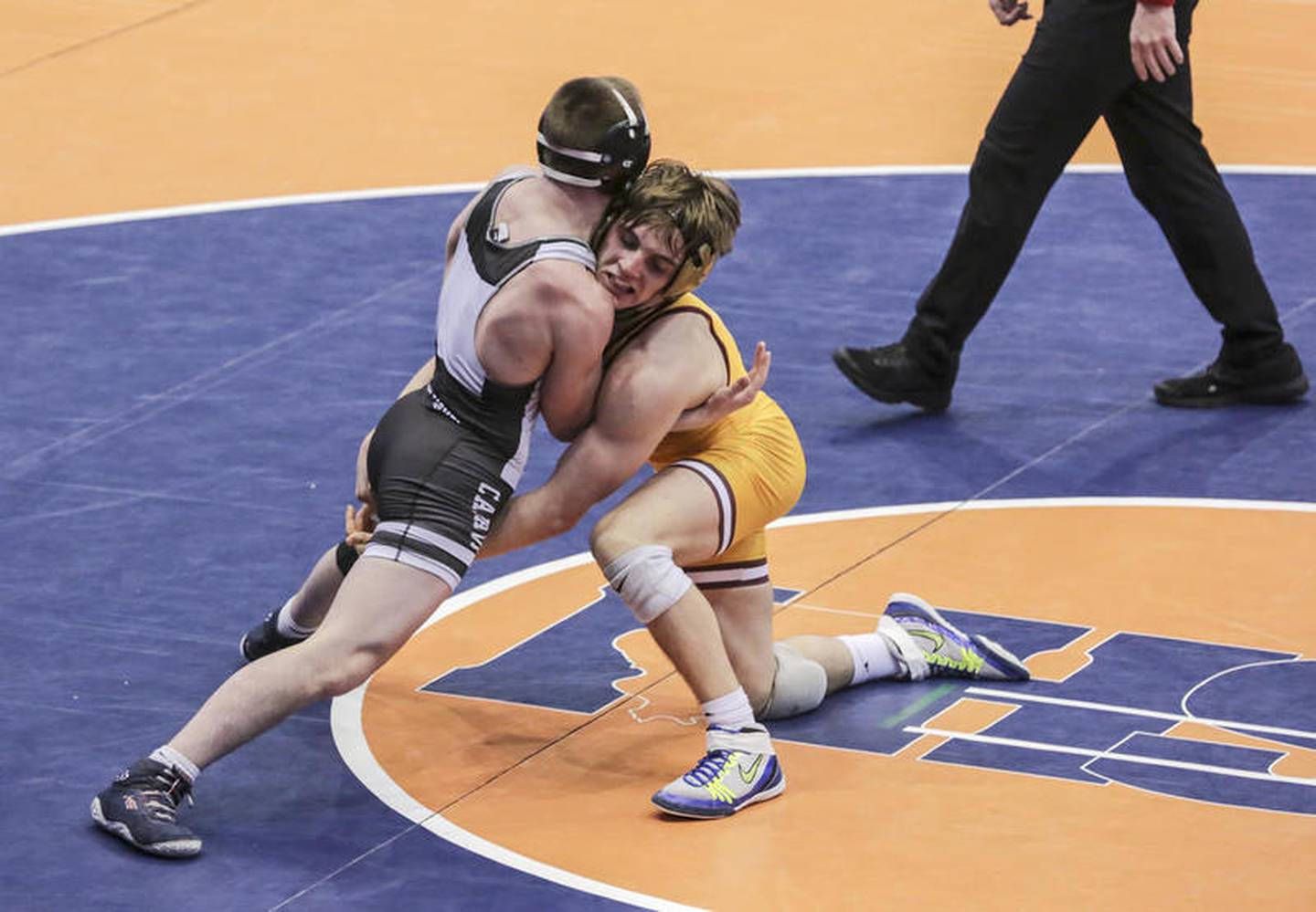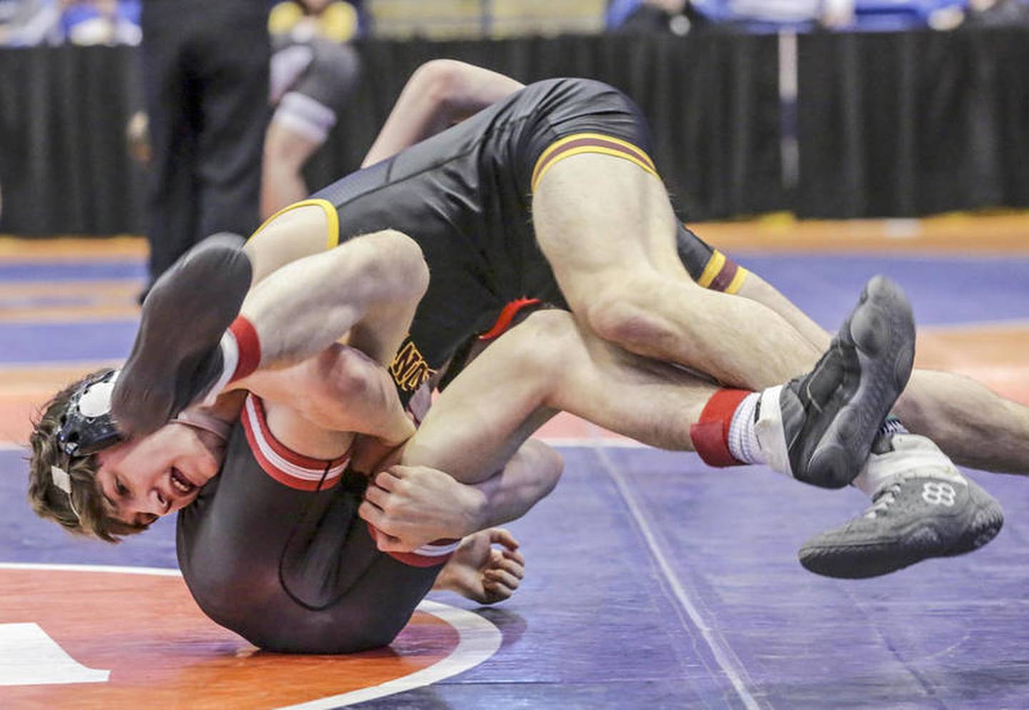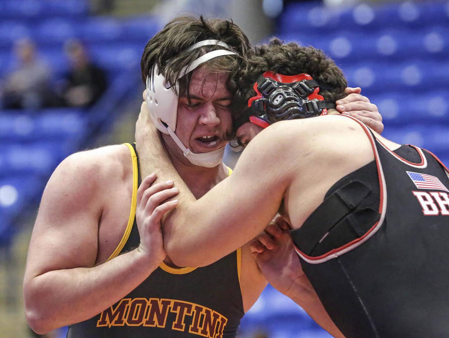 Montini's Brayden Thompson wrestles Mount Carmel's Ashton Breen on Saturday, Feb. 29, 2020, during the IHSA Dual Team Wrestling Championship at Grossinger Motors Arena in Bloomington, Ill. (Eric Ginnard)