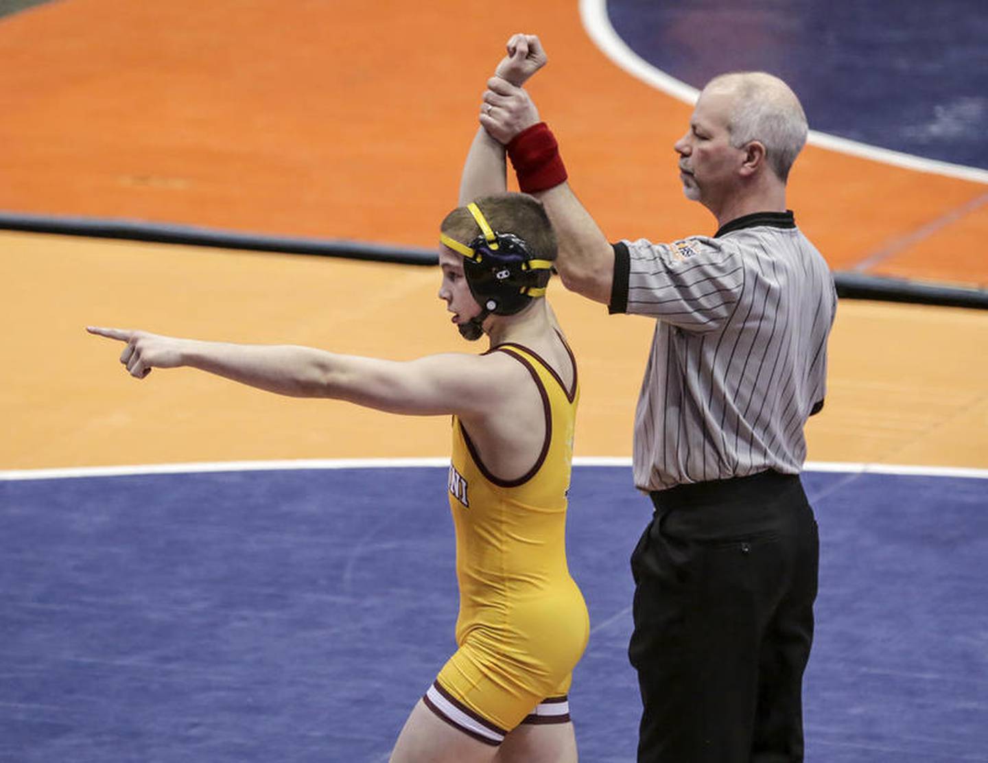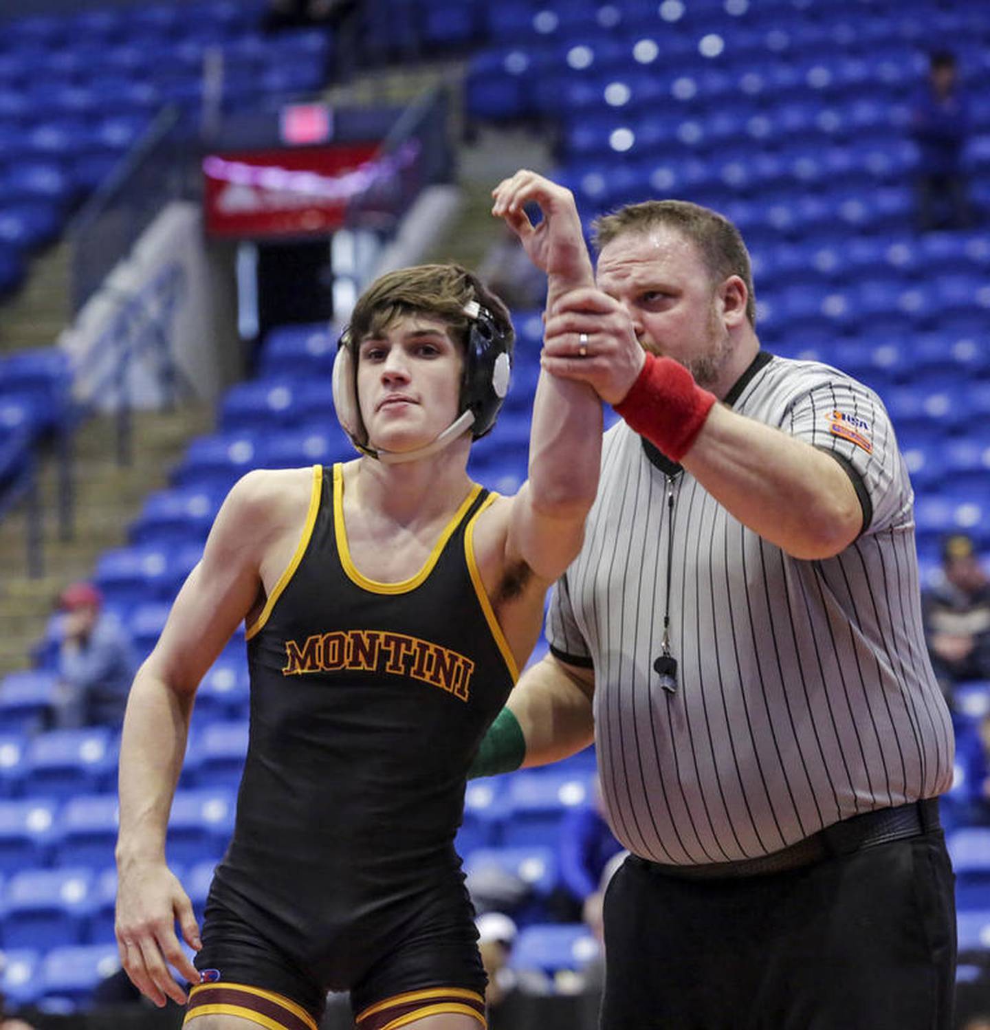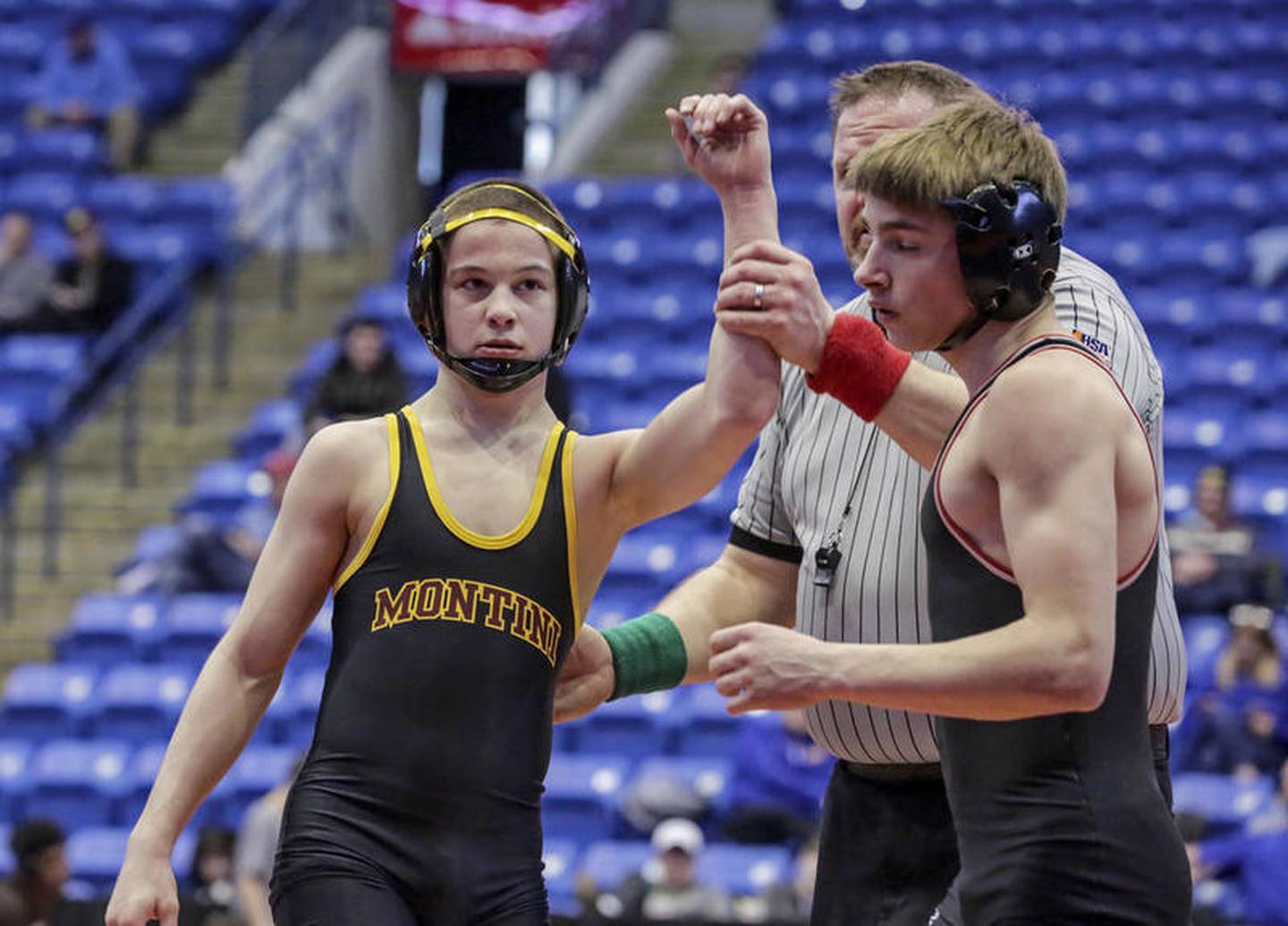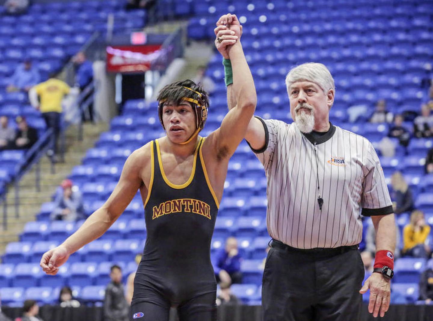Montini's Joe Fernau defeated Mount Carmel's Noel Rosales on Saturday, Feb. 29, 2020, during the IHSA Dual Team Wrestling Championship at Grossinger Motors Arena in Bloomington, Ill. (Eric Ginnard)