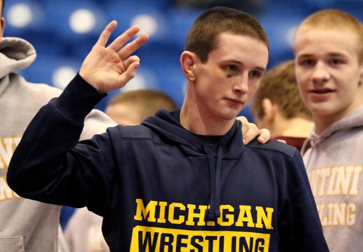 Montini's Dylan Ragusin holds up three fingers to symbolize their third consecutive state championship during IHSA state team wrestling finals on Saturday, Feb. 29, 2020 at the Grossinger Motors Arena in Bloomington. (Matthew Apgar)