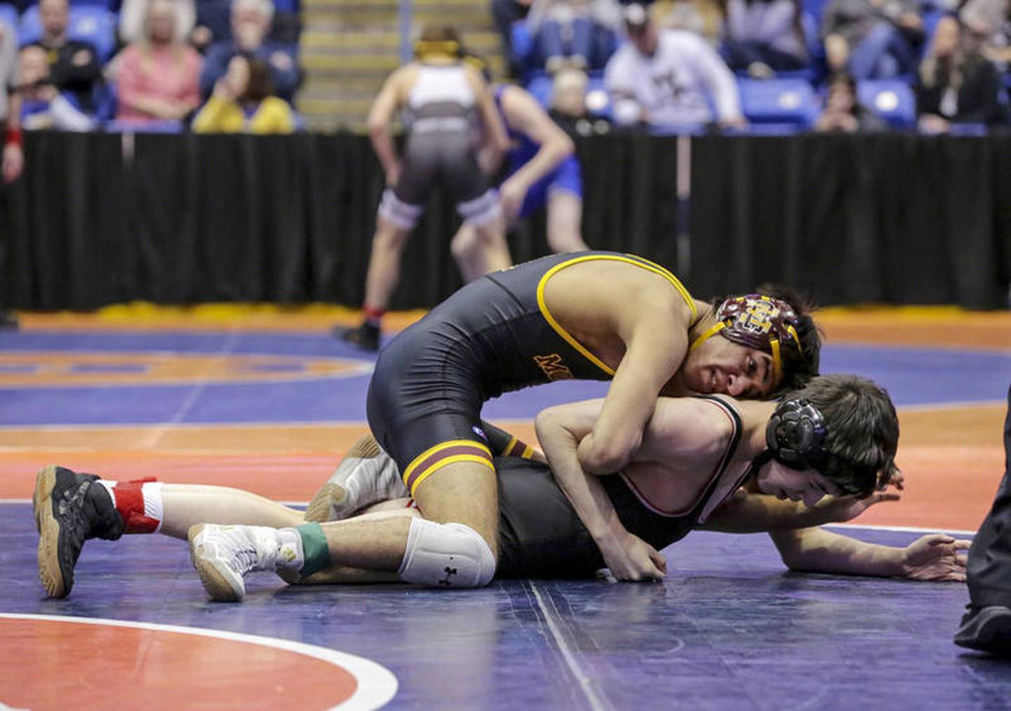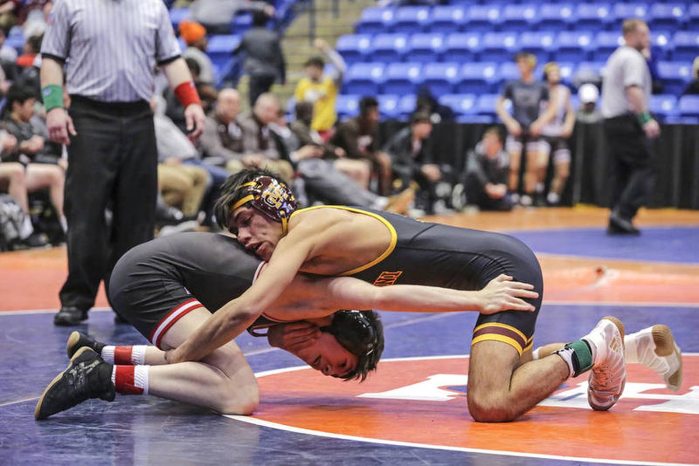 Montini's Joe Fernau works on Mt. Carmel's Noel Rosales in their 106 pound bout during IHSA state team wrestling semifinals on Saturday, Feb. 29, 2020 at the Grossinger Motors Arena in Bloomington. (Matthew Apgar)