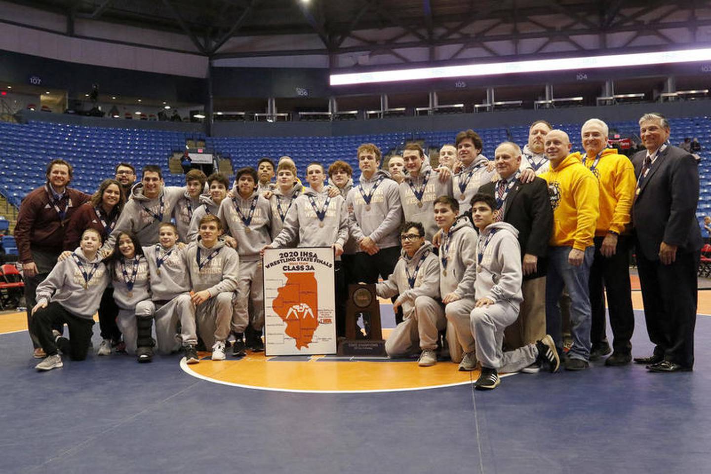 Montini wrestlers celebrate their state championship during IHSA state team wrestling finals on Saturday, Feb. 29, 2020 at the Grossinger Motors Arena in Bloomington. (Matthew Apgar)