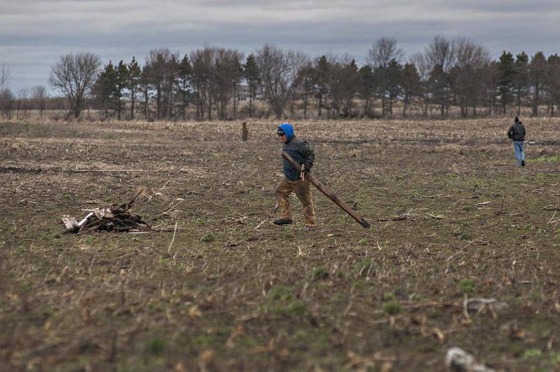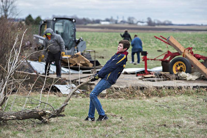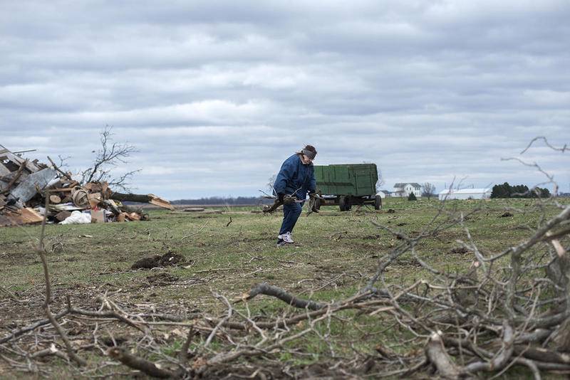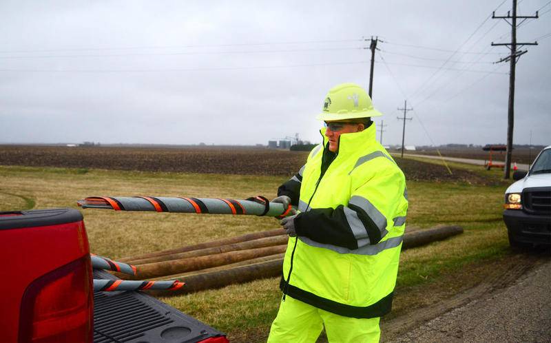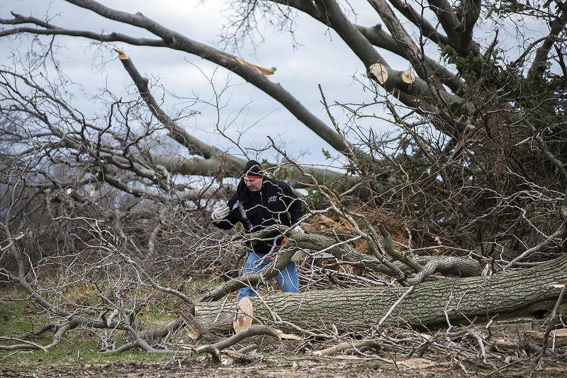 Brad Jackson, a traffic control worker with Heels and Hardhats Contracting Co., was busy this morning placing and removing signs along roads that had downed wires or damaged utility poles. Jackson worked through the night after the tornado passed through Ogle County.