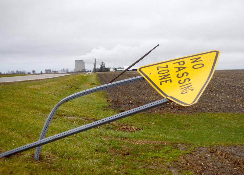 Further north on German Church, south of the Byron nuclear generating station, a "no passing" road sign was blown over along with utility poles on the east side of the county road.