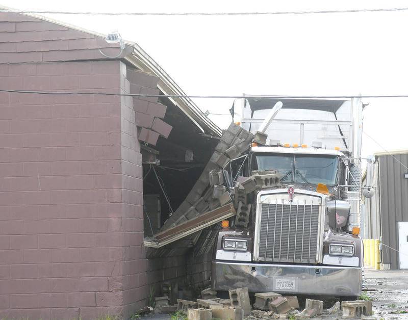 The east wall of a cement block building collapsed and fell on a nearby Moring Disposal semi-tractor.