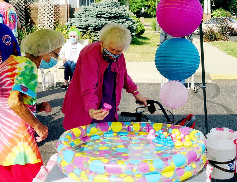 Greenfield turned its driveway into its own little fair Wednesday morning, complete with clowns, games, music and fair food to entertain its residents in place of their annual trip to the Bureau County Fair, which was canceled this year due to the coronavirus.
