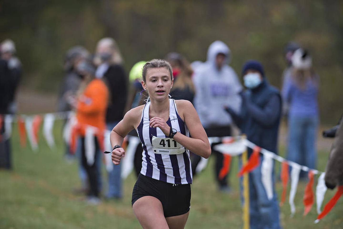 Rock Falls' Bryahna Ganther heads for the finish line Saturday at the Big Northern Cross Country Meet in Kingston. (Alex T)