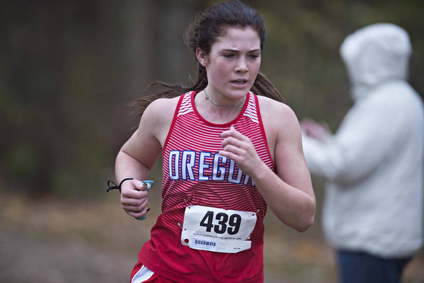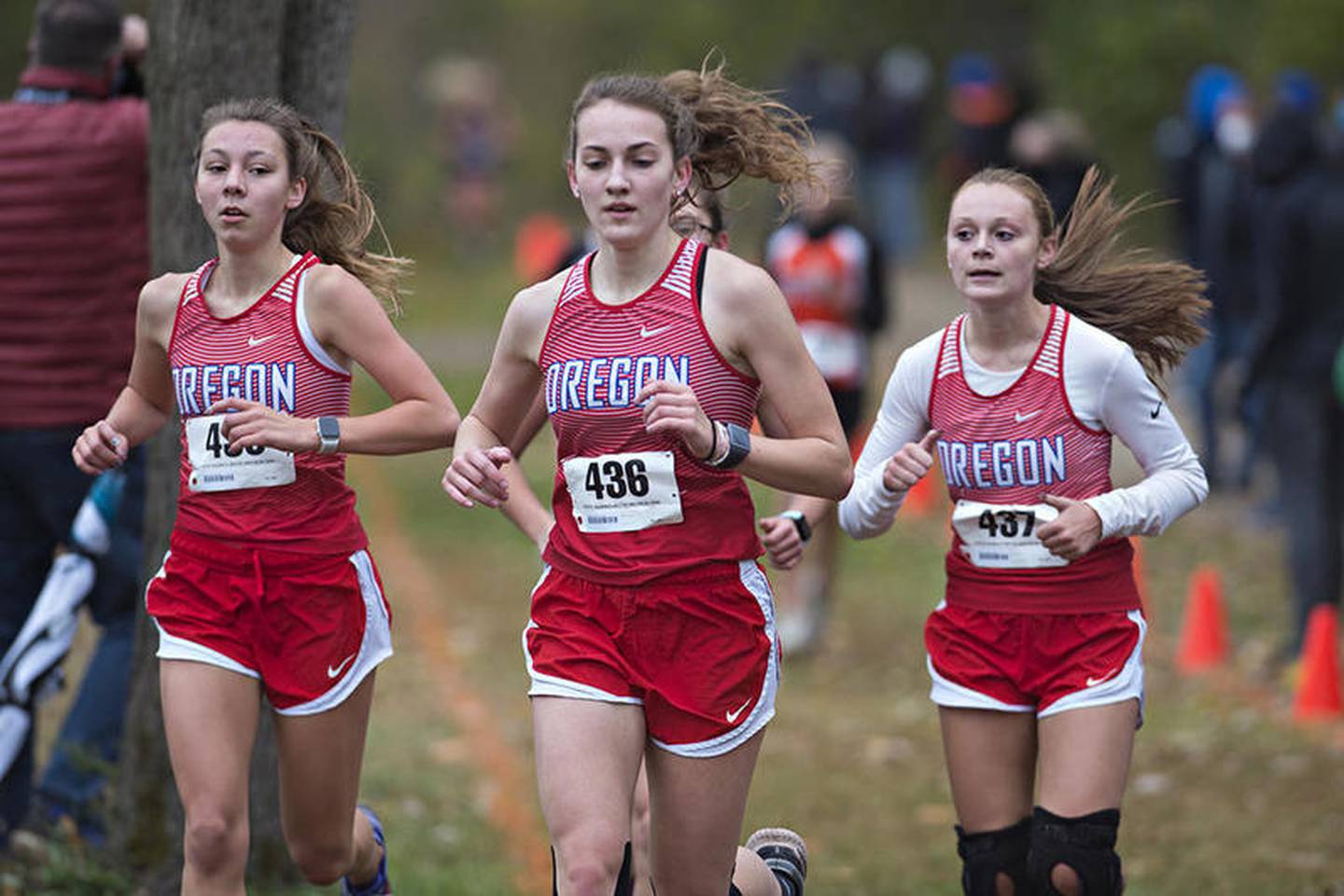 Oregon runners Leah Watters, Faith Marquardt and Katlyn Ramirez run as a pack in the Big Northern Cross Country Meet in Kingston. (Alex T)