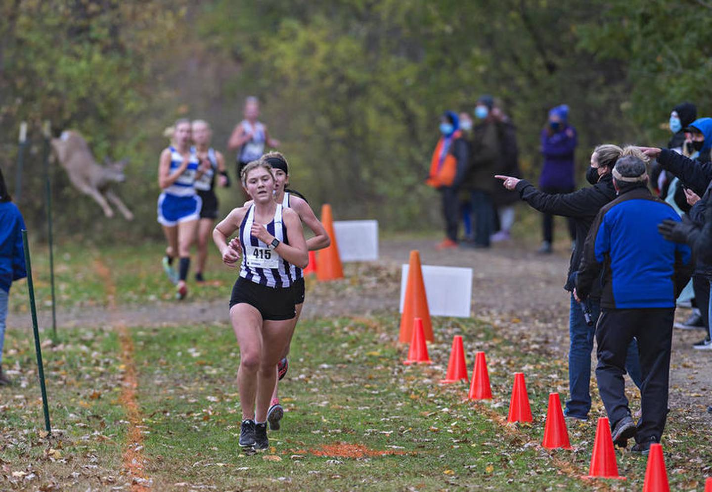 A deer leaps on the course behind Dixon's Paige Stees and other runners during the girl's Big Northern Cross Country Meet in Kingston. (Alex T)
