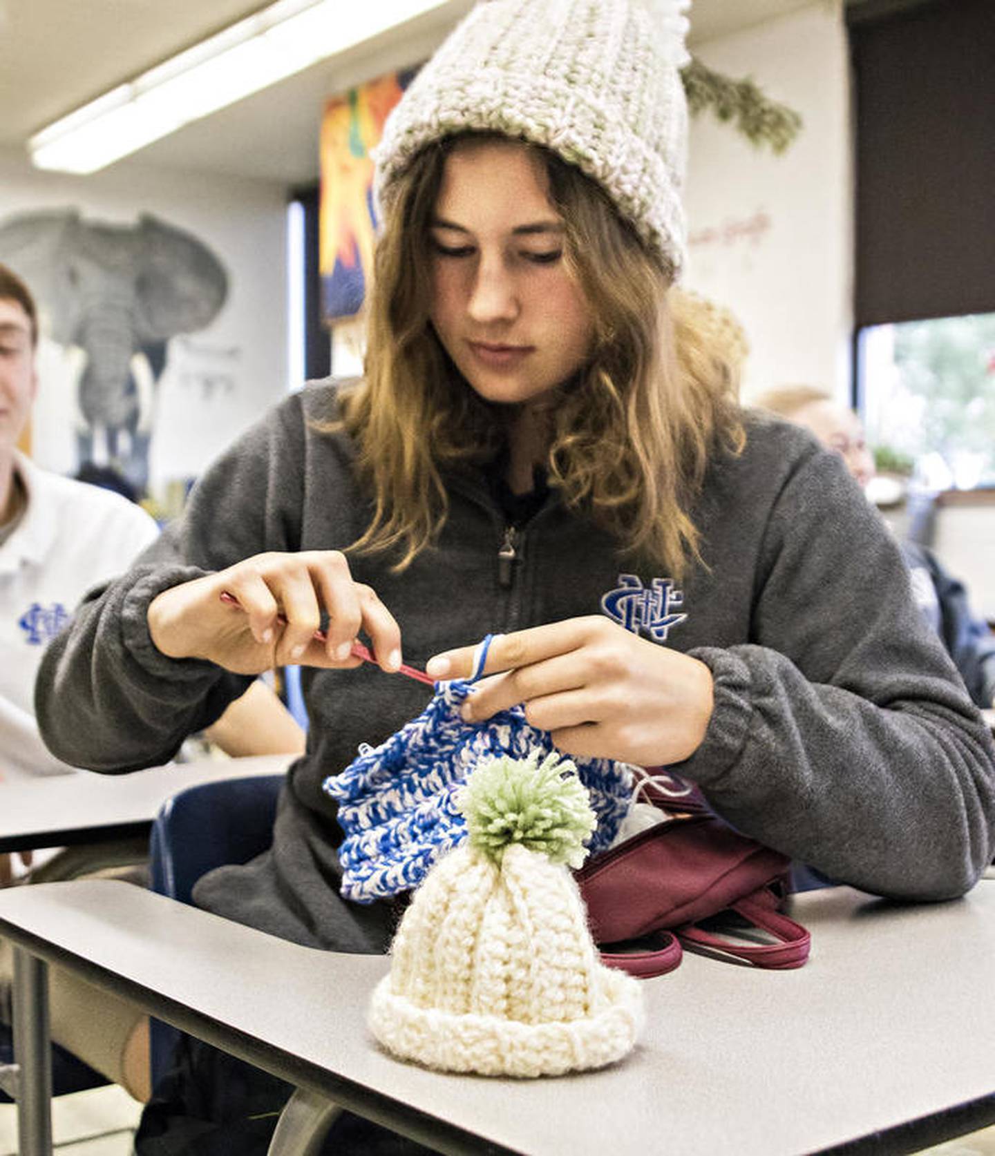 Newman sophomore Marisel Schalck works on a hat Friday afternoon, while wearing one she made, during a meeting of the Newman Knitters. (Michael Krabbenhoeft)