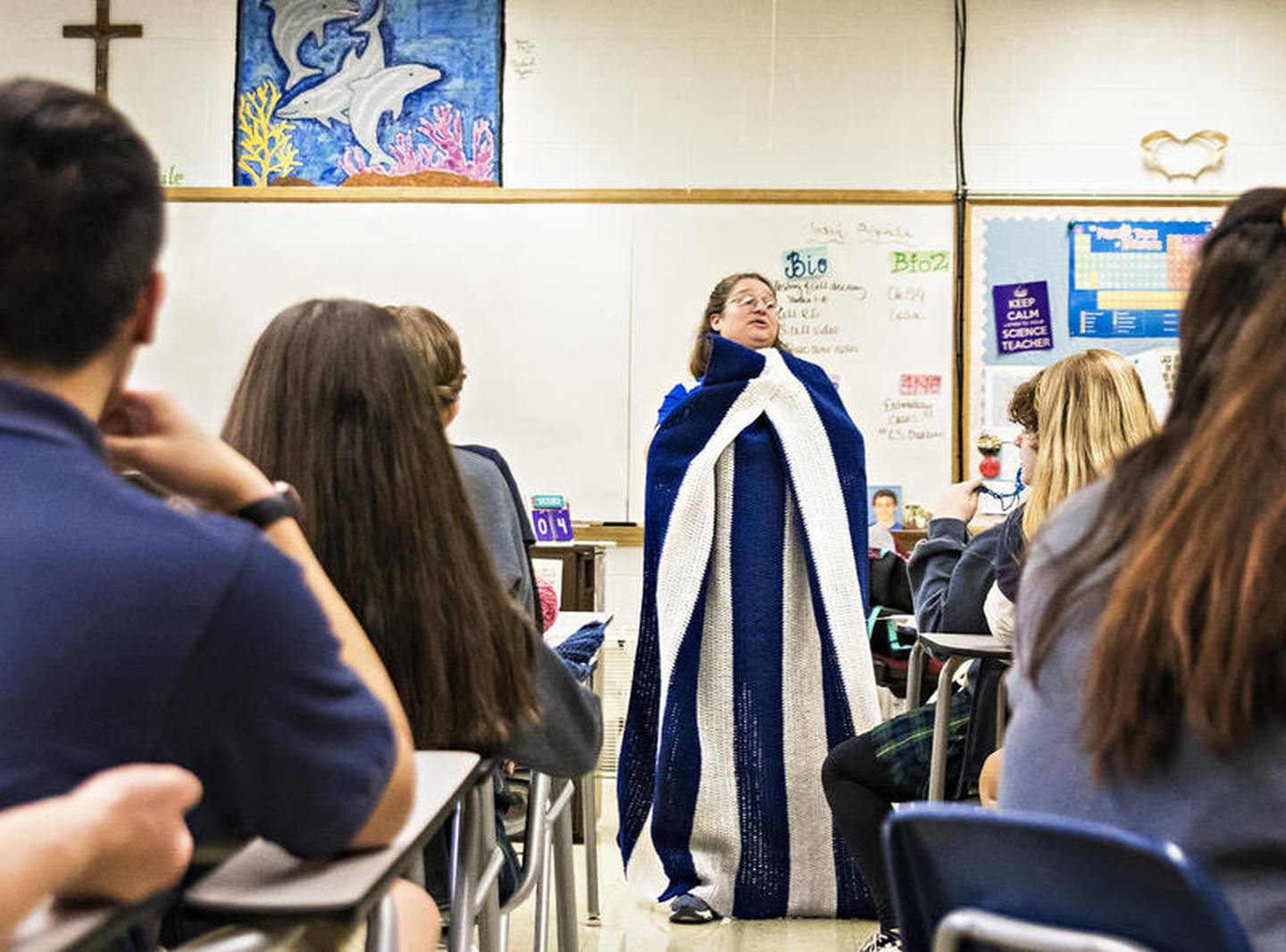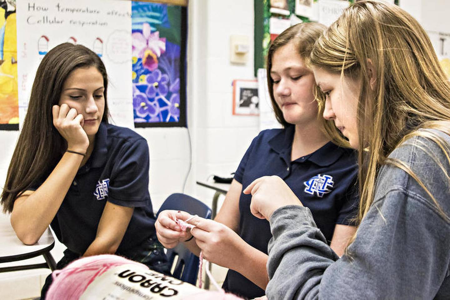 Beth Verdick works with students during a knitting club meeting Friday afternoon at Newman High School. (Michael Krabbenhoeft)