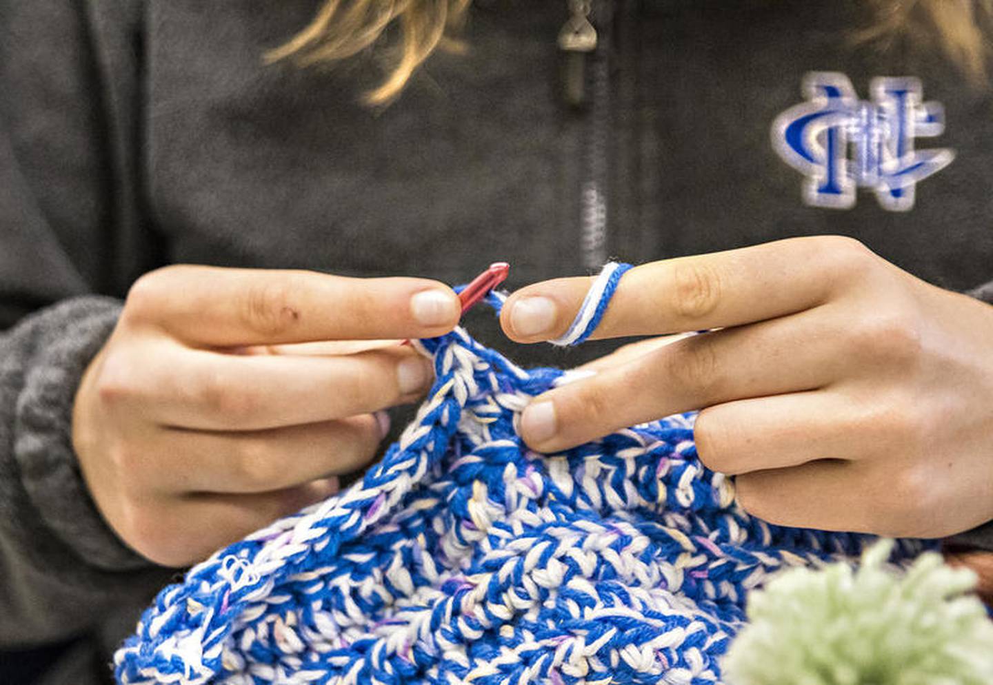 Newman sophomore Marisel Schalck works on a hat Friday afternoon during a meeting of the Newman Knitters. (Michael Krabbenhoeft)