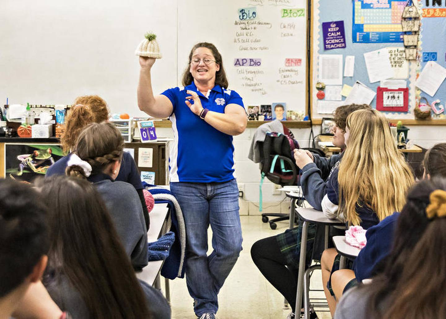 Newman science teacher and Newman Knitters adviser Beth Verdick holds up a small hat Friday afternoon during a club meeting at the school. Each club member will be working on making hats to be given to local hospitals for newborns. (Michael Krabbenhoeft)
