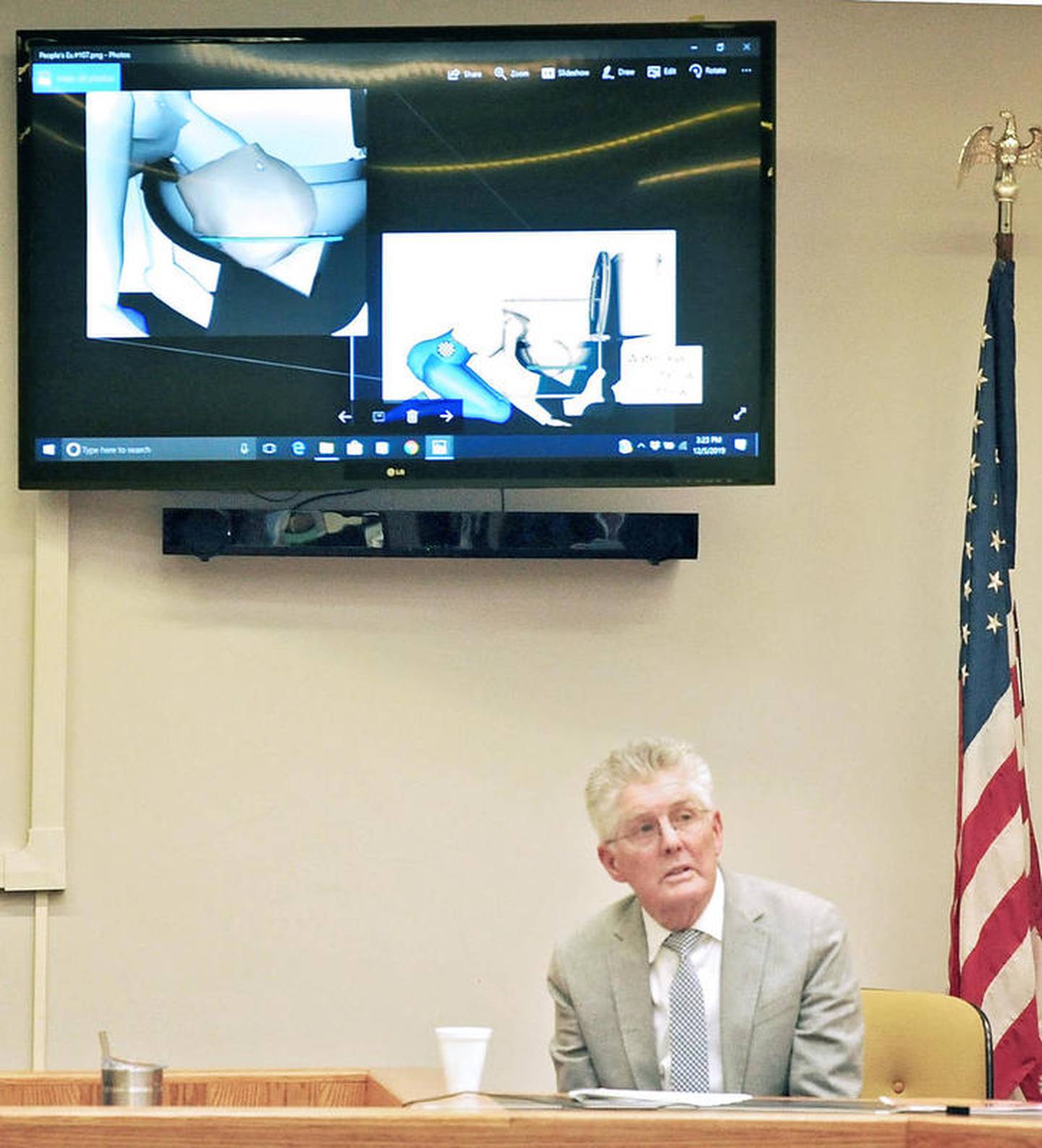 Dr. Wilson "Toby" Hayes, explains how they used CAD (computer-aided design) to create precision technical scenarios that are accurate as close to about a tenth of inch using the schematic from the manufacturer and the measurements from the scene. He was testifying about water levels in toilets in an Ottawa, Ill., trial in which a man is accused of drowning his wife. (Tracey MacLeod)
