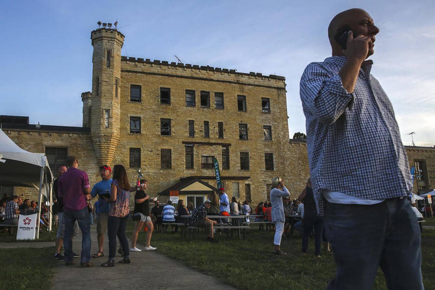 Visitors enjoy drinks in the prison yard on Saturday, Aug. 24, 2019, at Old Joliet prison in Joliet, Ill. The Joliet Prison Break In event raises funds to further restore the prison as a tourist and historical destination. (Shaw Media)