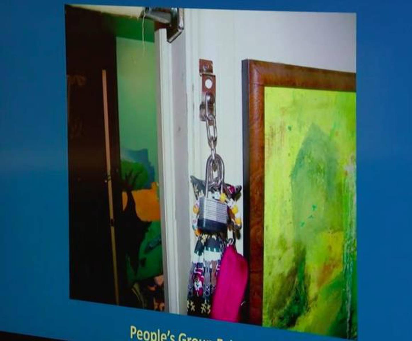 Photos of a padlock on the outside of AJ Freund's home taken on April 18, 2018, at AJ Freund's Dole Avenue home.