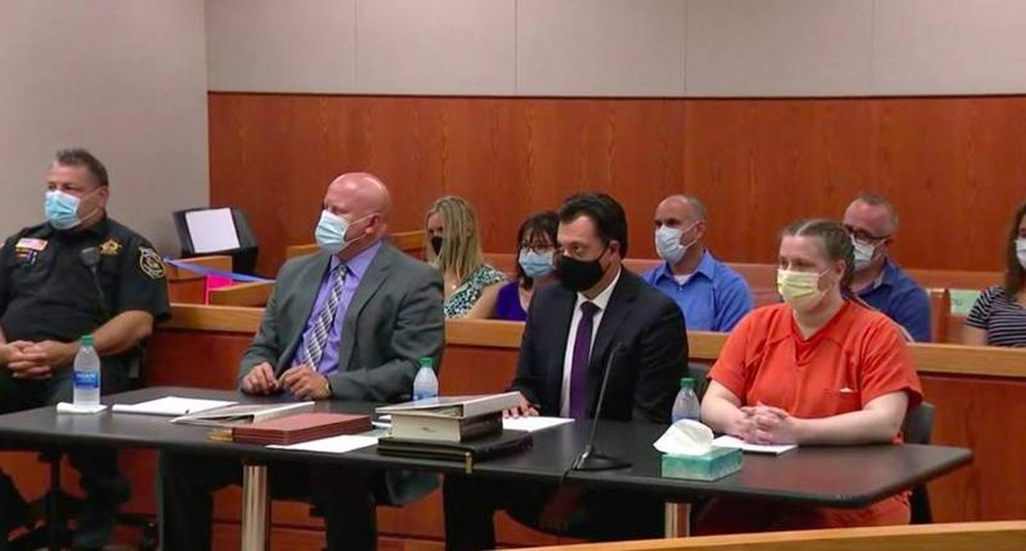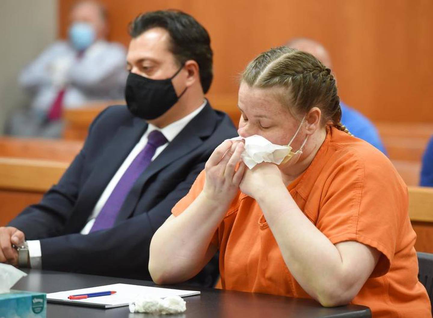 John Starks/jstarks@dailyherald.com JoAnn Cunningham, 37, cries and wipes her nose during a sentencing hearing in Woodstock Thursday, July 16, 2020. With her is Public Defender Angelo Mourelatos. She pled guilty in December to killing her five-year-old son A.J. Freund Jr. in April, 2019 in her Crystal Lake home. His body was found in a shallow grave in Woodstock. (John Starks)