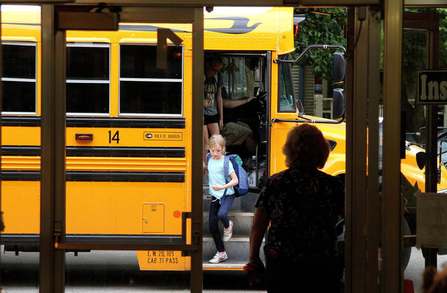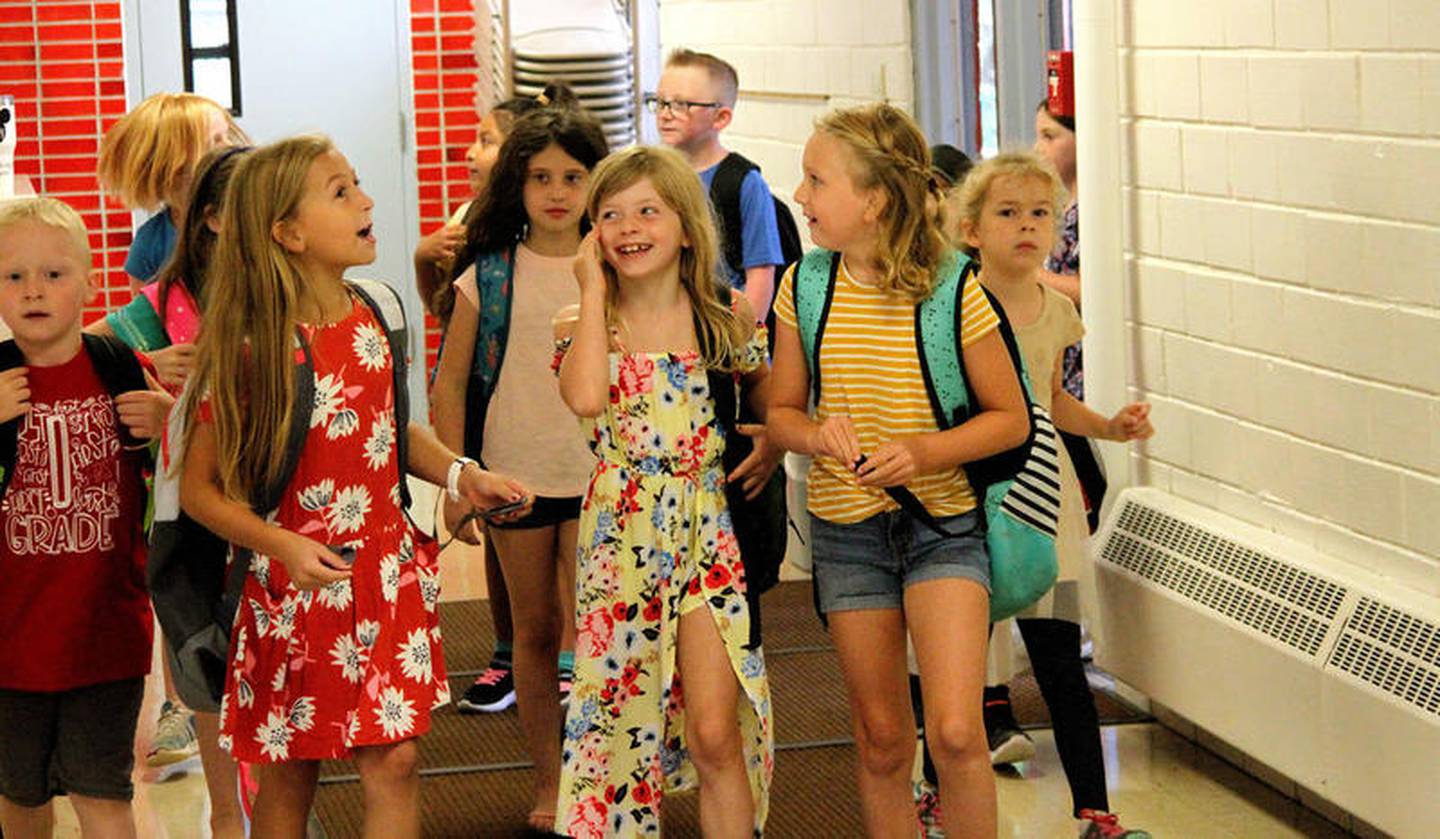 W.W. Woodbury Elementary School students make their way to their classrooms on the first day of the 2019-2020 school year, Friday, Aug. 16. (Shea Lazansky)