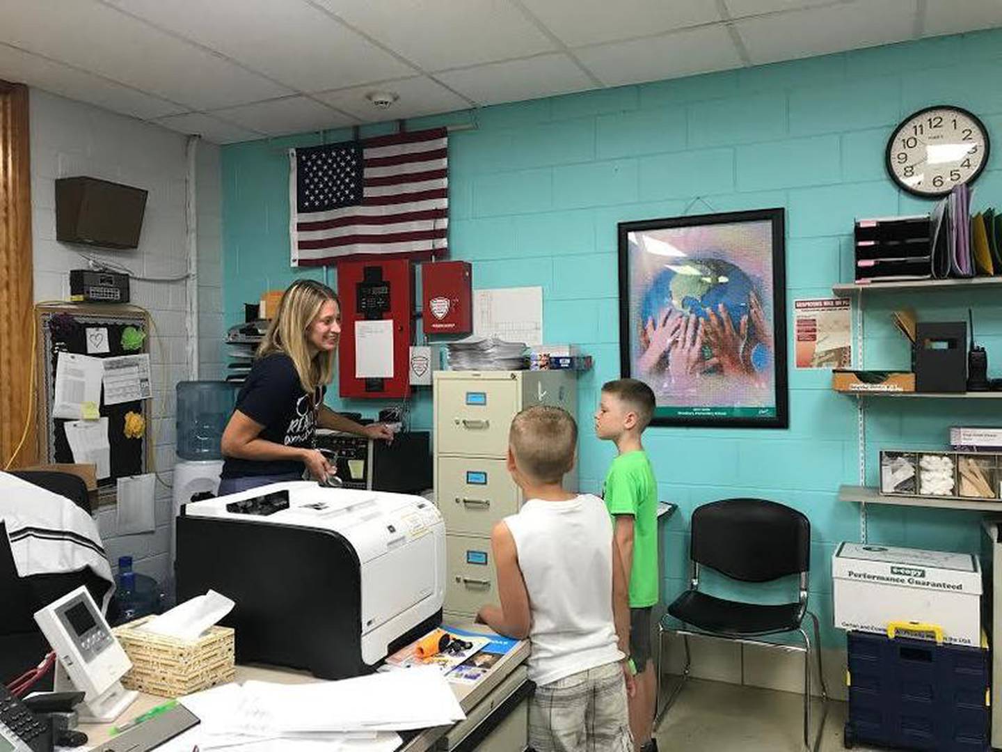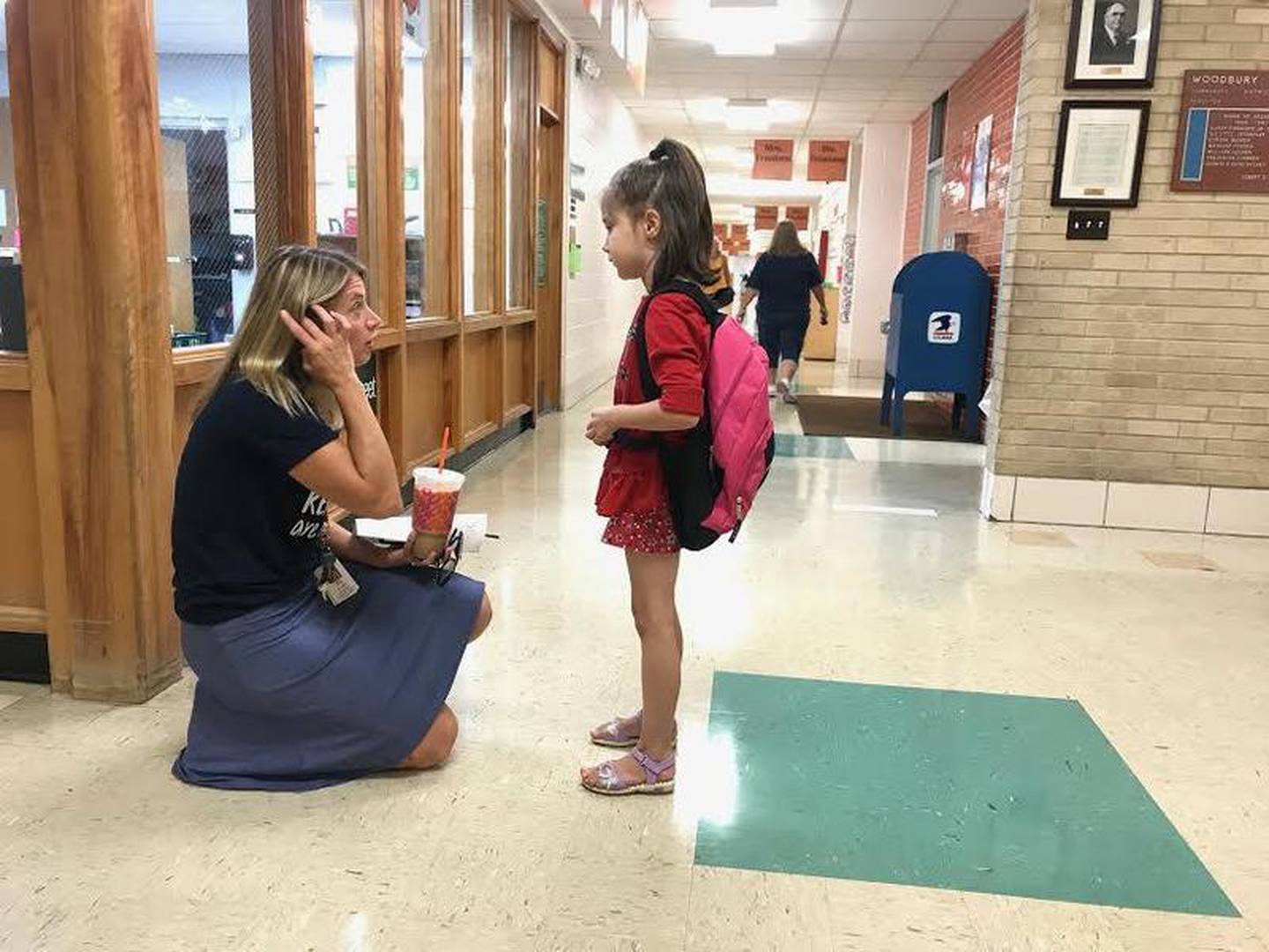 Principal Jennifer Kern greeted students as they returned to W.W. Woodbury Elementary School for the first day of the 2019-2020 school year, Friday morning. (Shea Lazansky)