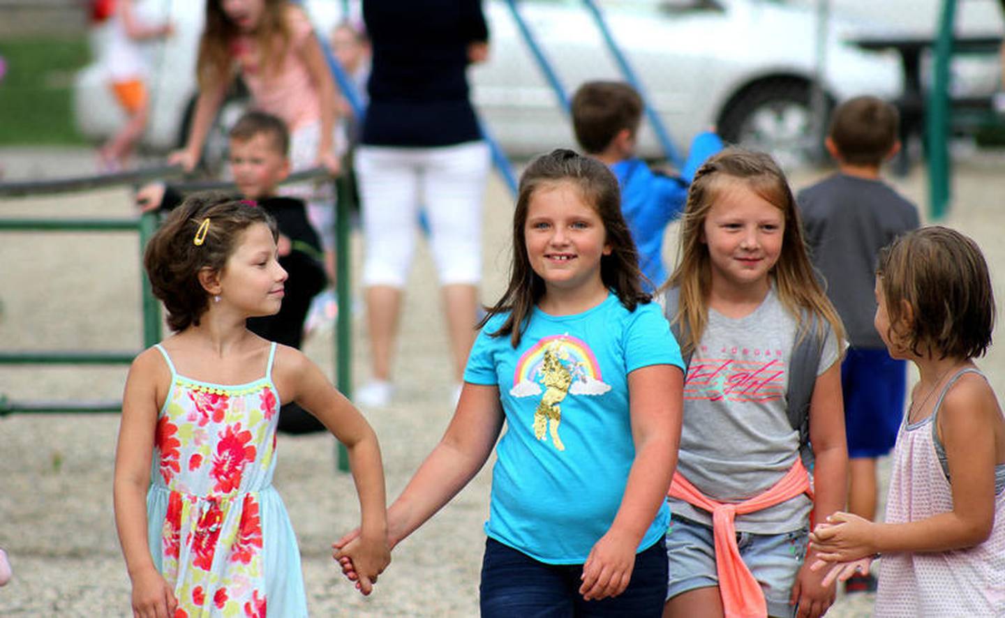 Students found old friends and made new friends on the playground of W.W. Woodbury Elementary School, Friday, Aug. 16, as classes began for the 2019-2020 school year. (Shea Lazansky)