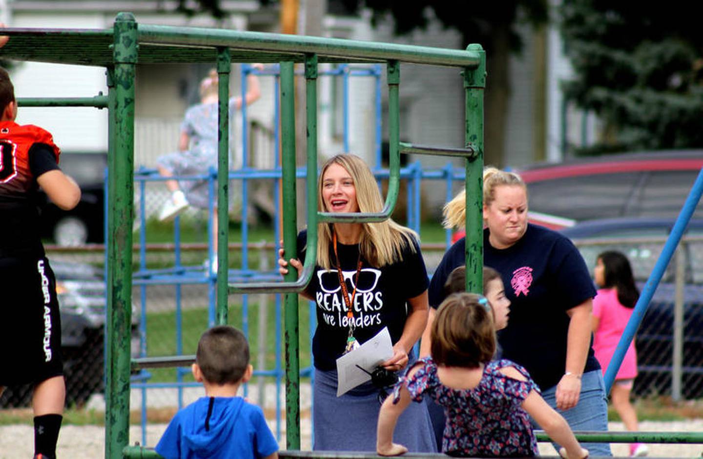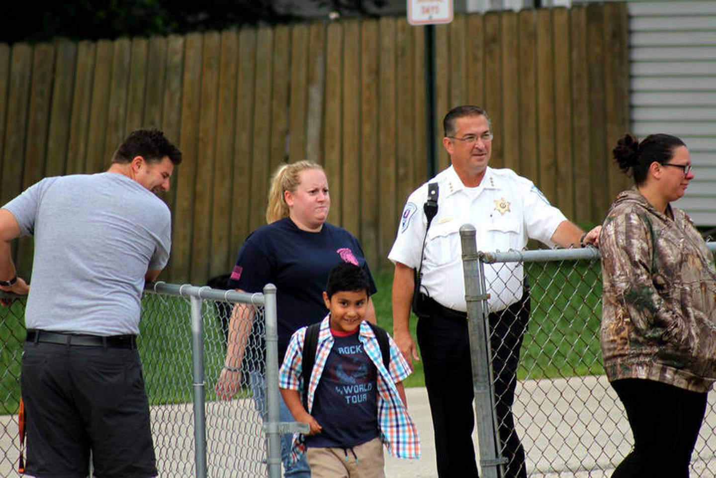 Teachers and administrators from W.W. Woodbury Elementary School greeted students on the playground, before the start of the school day, Friday, Aug. 16. (Shea Lazansky)