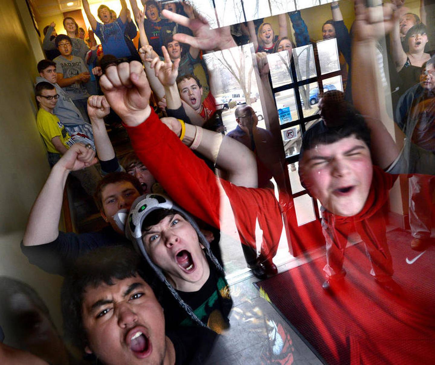 Ottawa High School students protest the dismissal of building trades instructor Dave Keely inside the school lobby before heading outside in March 2014. The reflection of school officials can be seen in the glass window pane. The high school discontinued its building trades course that year. (The Times)