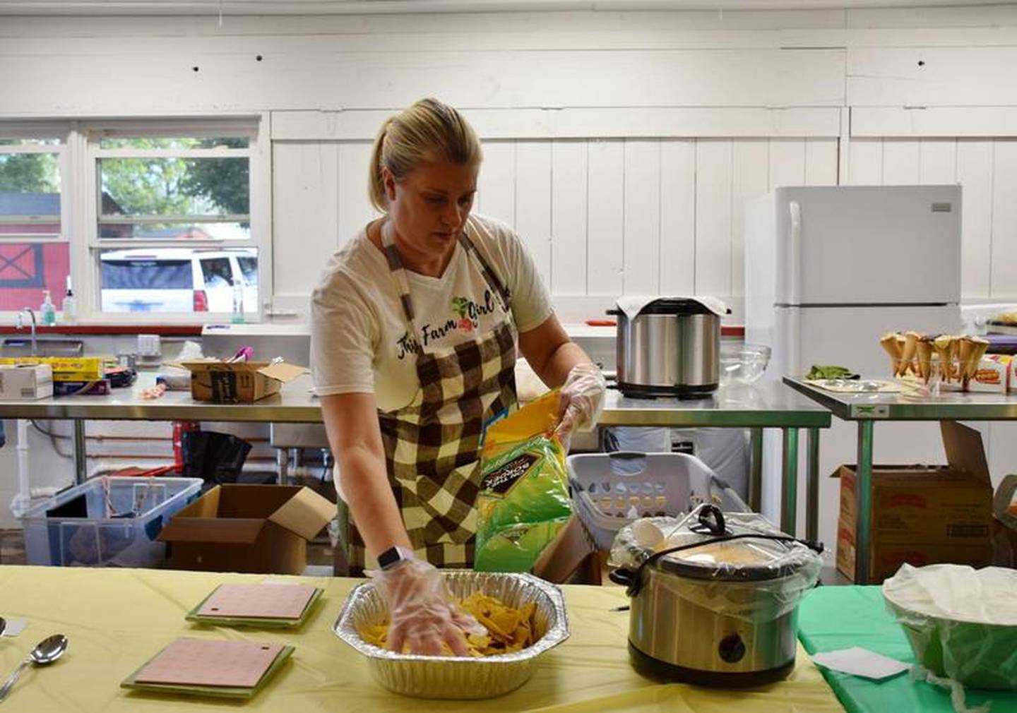 Deanne Frieders prepares food for the free community dinner on Wednesday, Sept. 25, at Lions Park in Waterman. Frieders, who runs This Farm Girl Cooks food blog, and her friend Katie Betz co-chaired the event in partnership with The Family Dinner Project and local sponsors. (Katrina J)