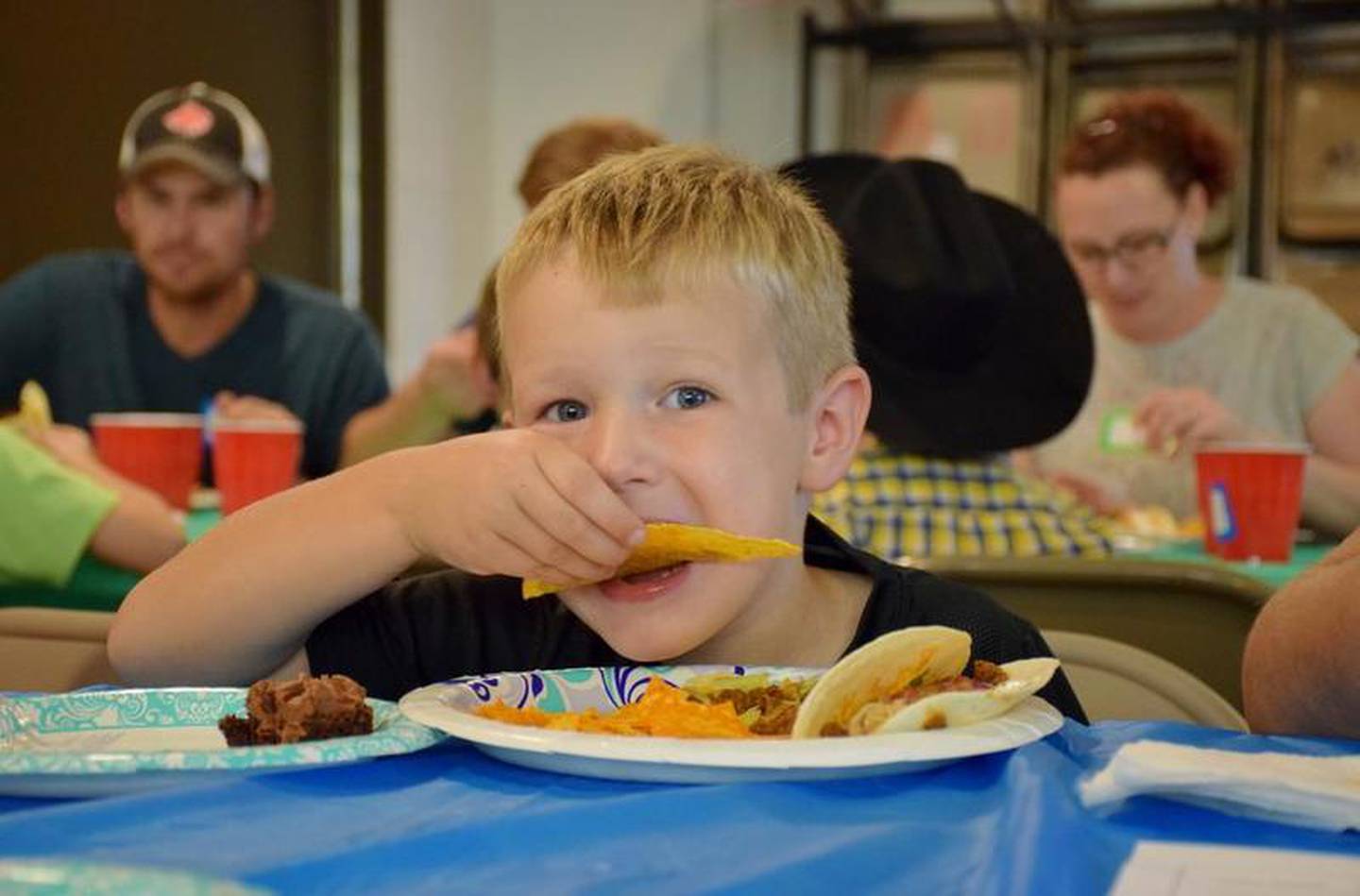 Henry Betz of Waterman, 4, eats a taco during the free community dinner on Wednesday, Sept. 25, at Lions Park in Waterman. The event's goal was to empower families to build community through their own dinner tables. (Katrina J)