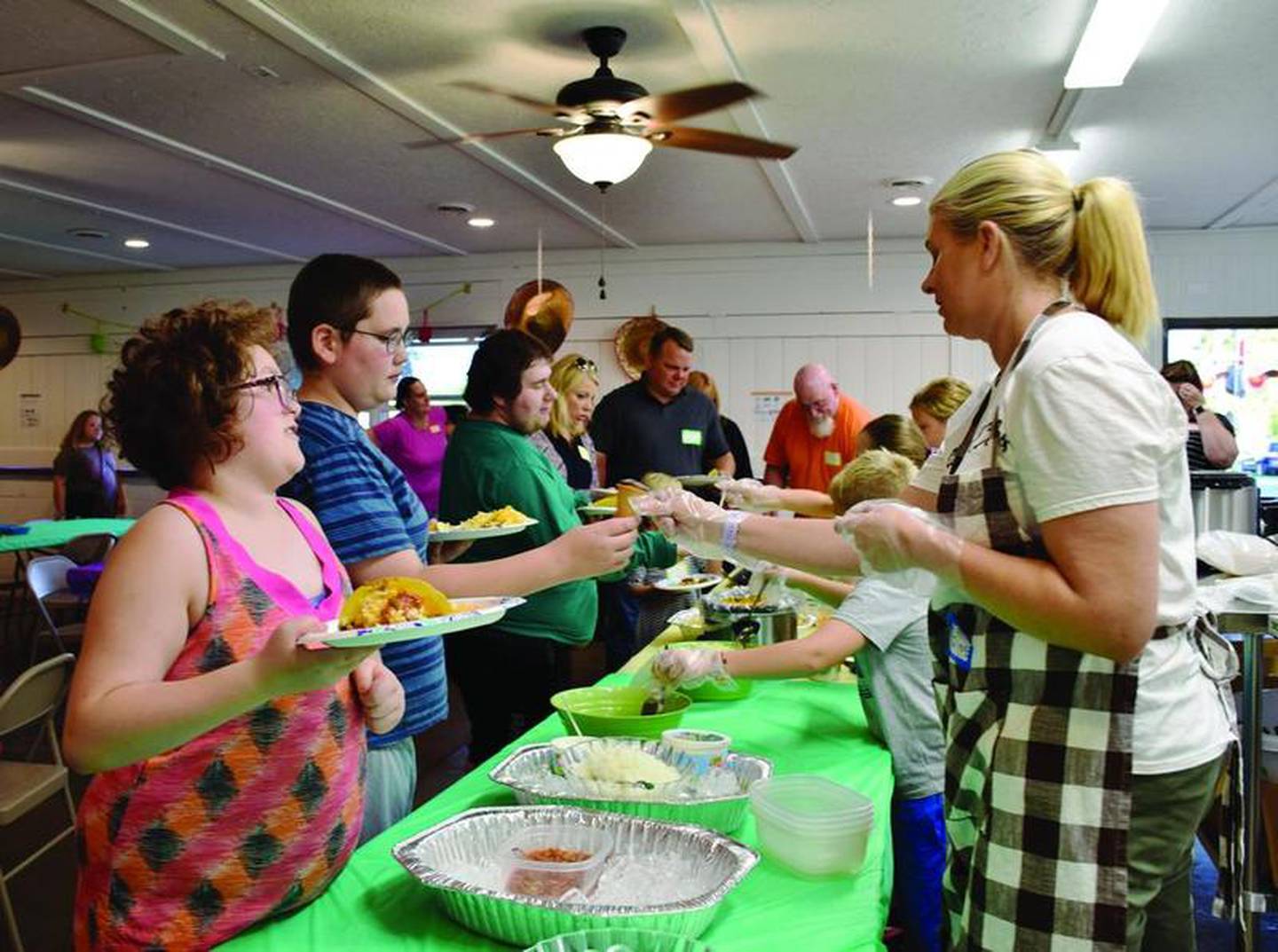 Deanne Frieders (right) helps serve attendees of the free community dinner on Wednesday, Sept. 25, at Lions Park in Waterman. Frieders, who runs This Farm Girl Cooks food blog, and her friend Katie Betz co-chaired the event in partnership with The Family Dinner Project and local sponsors. (Katrina J)