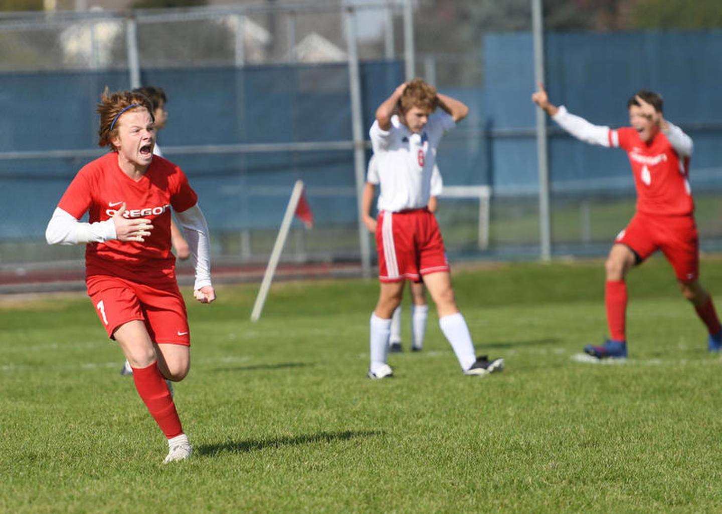 Oregon's Alvaro Soler (7) reacts after scoring a goal against Woodstock Marian at the regional final in Johnsburg on Sunday. Soler scored the first goal in the Hawks' 2-0 win. (Earleen Hinton)