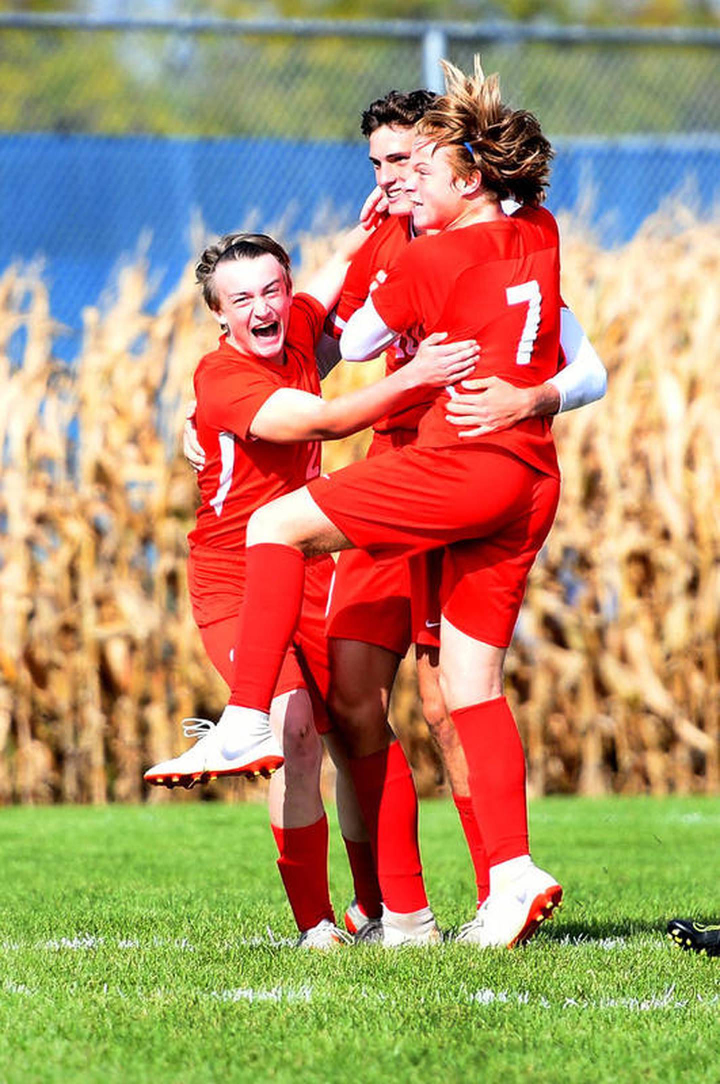 Oregon's Adam Thorsen (left) and Alvaro Soler (right) celebrate with Josh Sitze (center) after he scored the Hawks' second goal at the Johnsburg Regional on Sunday. (Earleen Hinton)