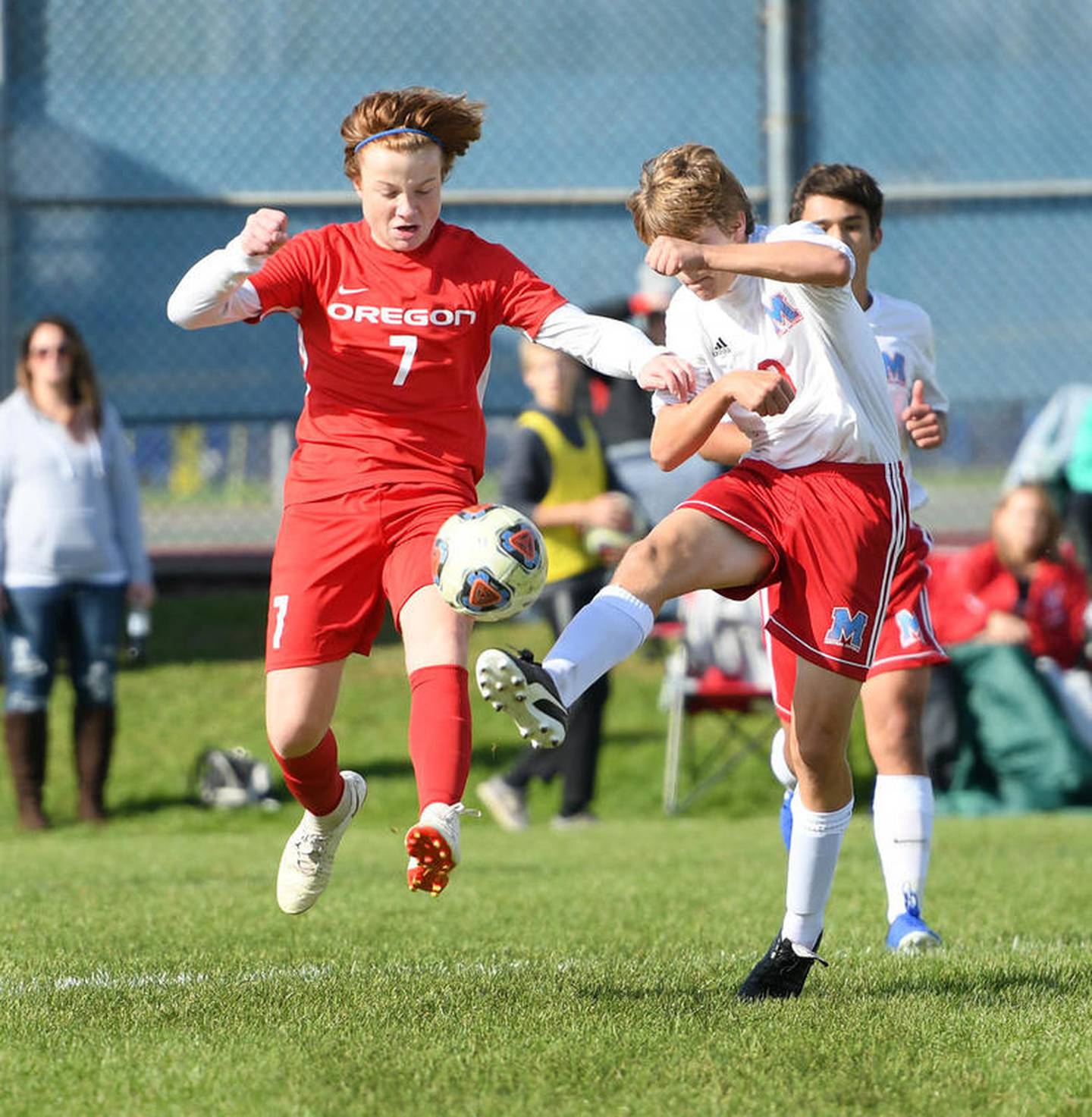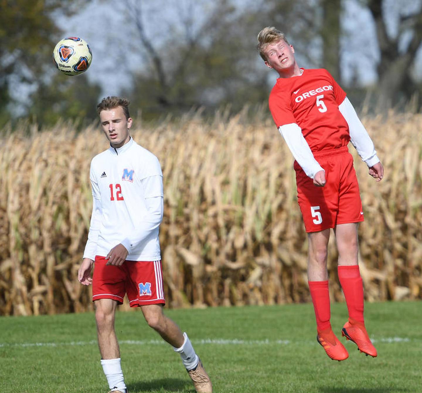 Oregon's Jayden Davis (5) heads a ball against Woodstock Marian players during the regional final in Johnsburg on Sunday. (Earleen Hinton)