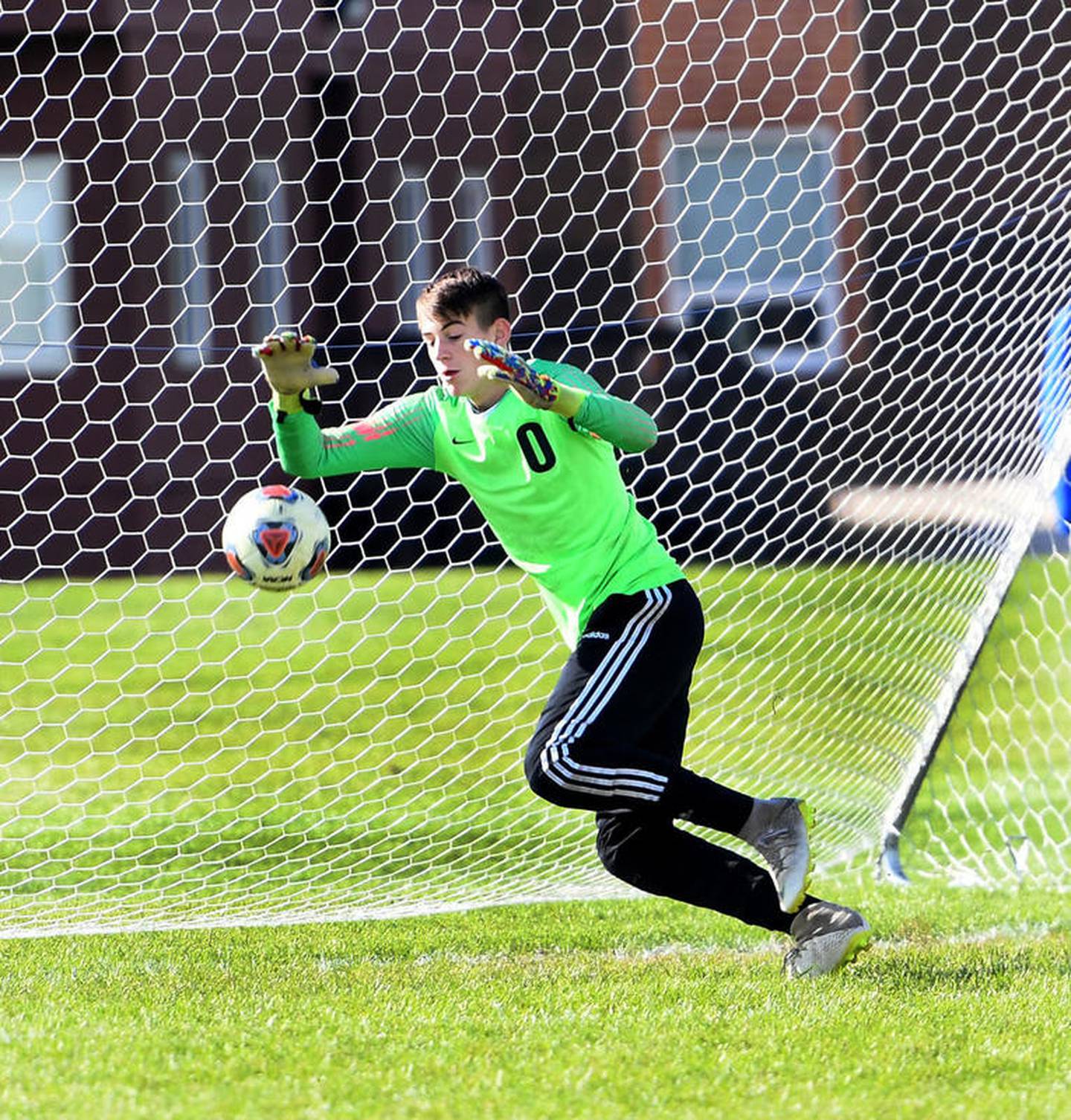 Oregon goalkeeper Owen Ketter gets ready to catch a shot on goal during action against Woodstock Marian at the regional final in Johnsburg on Sunday. (Earleen Hinton)
