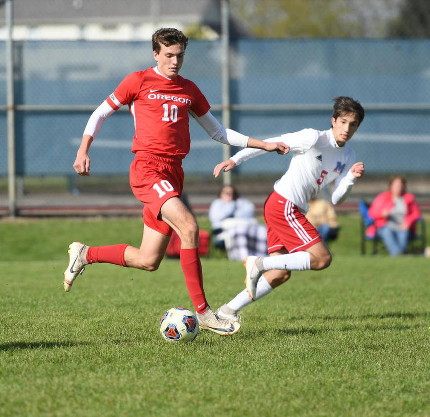 Oregon's Josh Sitze (10) breaks towards the goal as a Woodstock Marian player follows during the regional final in Johnsburg on Sunday. Sitze scored the second goal in the Hawks' 2-0 win. (Earleen Hinton)