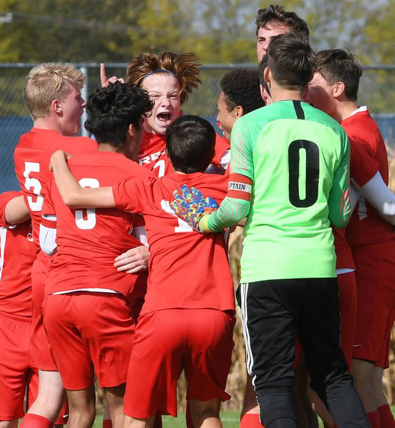Oregon's Alvaro Soler (center) celebrates with his teammates after the Hawks won the Johnsburg Regional downing Woodstock Marian 2-0. (Earleen Hinton)