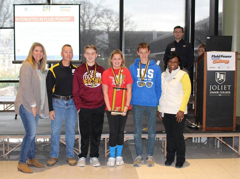 The Overall Winner at the JJC Fluid Power Competition was Morris' Immaculate Conception School. Pictured are (from left) teacher Janelle Aldrich, Steve Ufheil from Caterpillar, students Lucas Munsell, Either Katey Lawyer, and Andrew Danek, and Tamara Holman of Caterpillar. Not pictured is student Faith Ragan. (Photo provided)