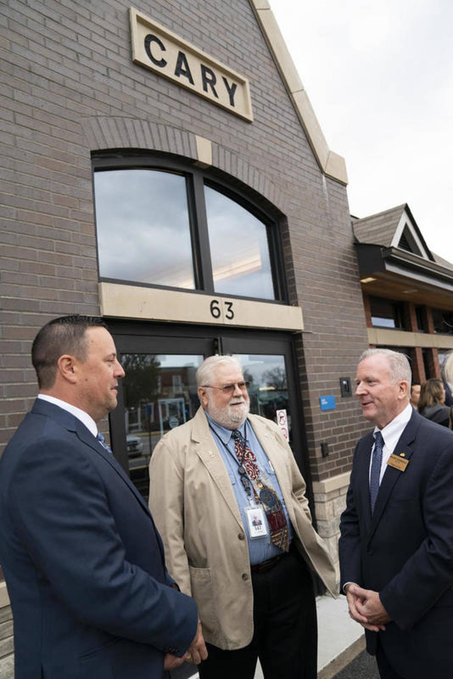 Cary trustee Dale Collier (left), Ken Koehler, a member of the Metra board of directors, and Cary Mayor Mark Kownick speak after the dedication ceremony for the new Cary Metra Station on Wednesday, Nov. 6, 2019. (Ryan Rayburn)