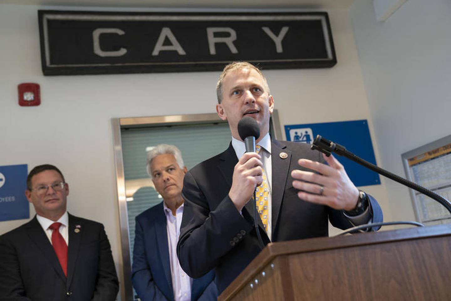 U.S. Rep. Sean Casten, D-IL, speaks during the dedication ceremony for the new Cary Metra Station along with Jim Derwinski (left), Metra CEO/Executive Director and Jack Franks, County Board chairman, on Wednesday, Nov. 6, 2019. (Ryan Rayburn)