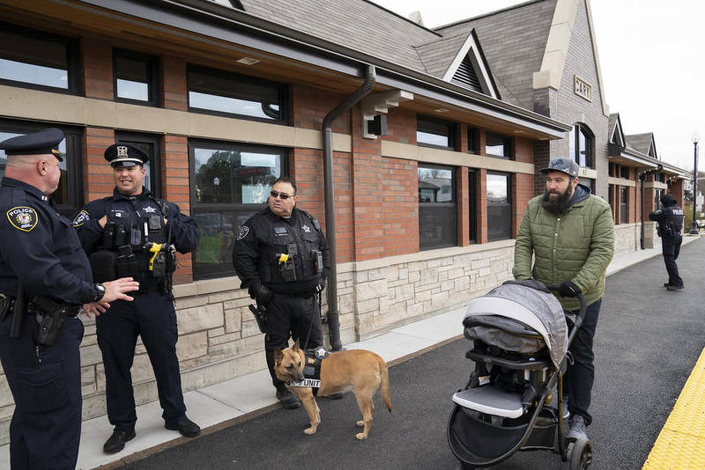 Cary resident Vince Foss (right) walks with his 4-month-old baby, Vince Jr., past Metra police officers Capt. Michael O’ Neill, Mark Engle and K-9 officer Raul Arevalo during a dedication ceremony for the new Cary Metra station on Wednesday. (Ryan Rayburn)