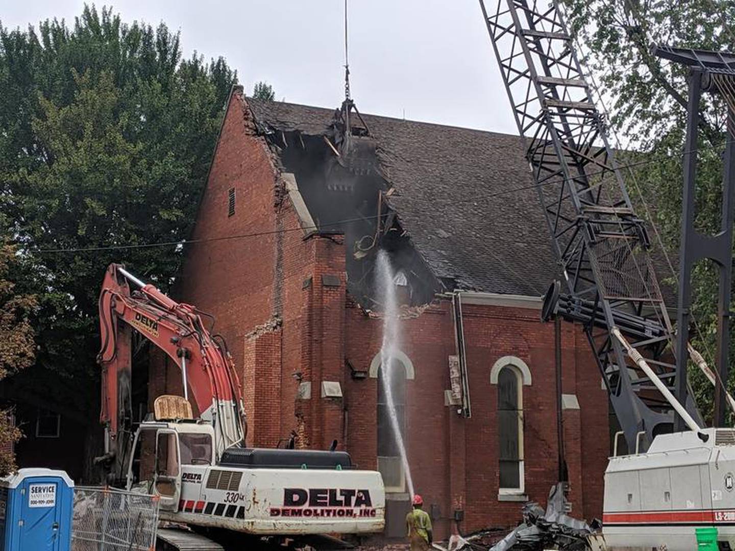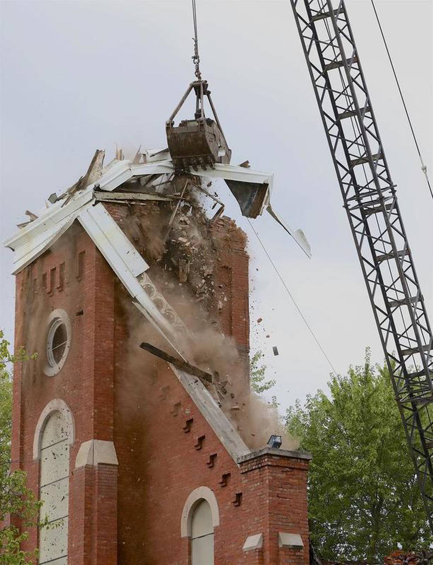 The demolition crew collapses the roof of Immaculate Conception Church in Morris. The 153 year old church was too damaged to warrant repairs, according to the Diocese of Joliet. (Brandon Grossi)