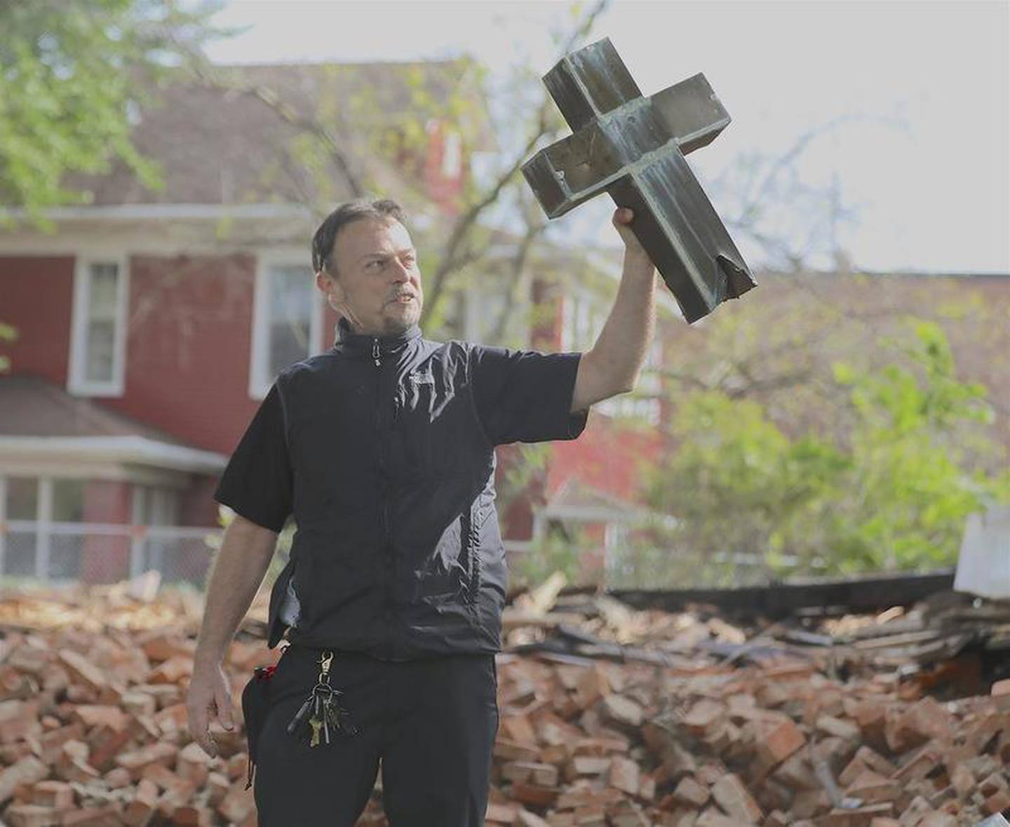 Fr. Ed Howe holds the cross from atop the steeple of the 153 year old Immaculate Conception church in Morris after the structure was razed last week. (Dan Voitik)