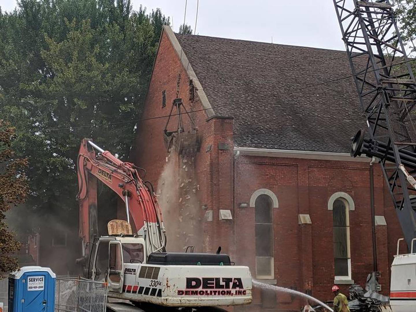 The bricks of the Immaculate Conception Church chimney shower down at the start of the demolition. Workers hose down the building to fight potential dust clouds. (Brandon Grossi)