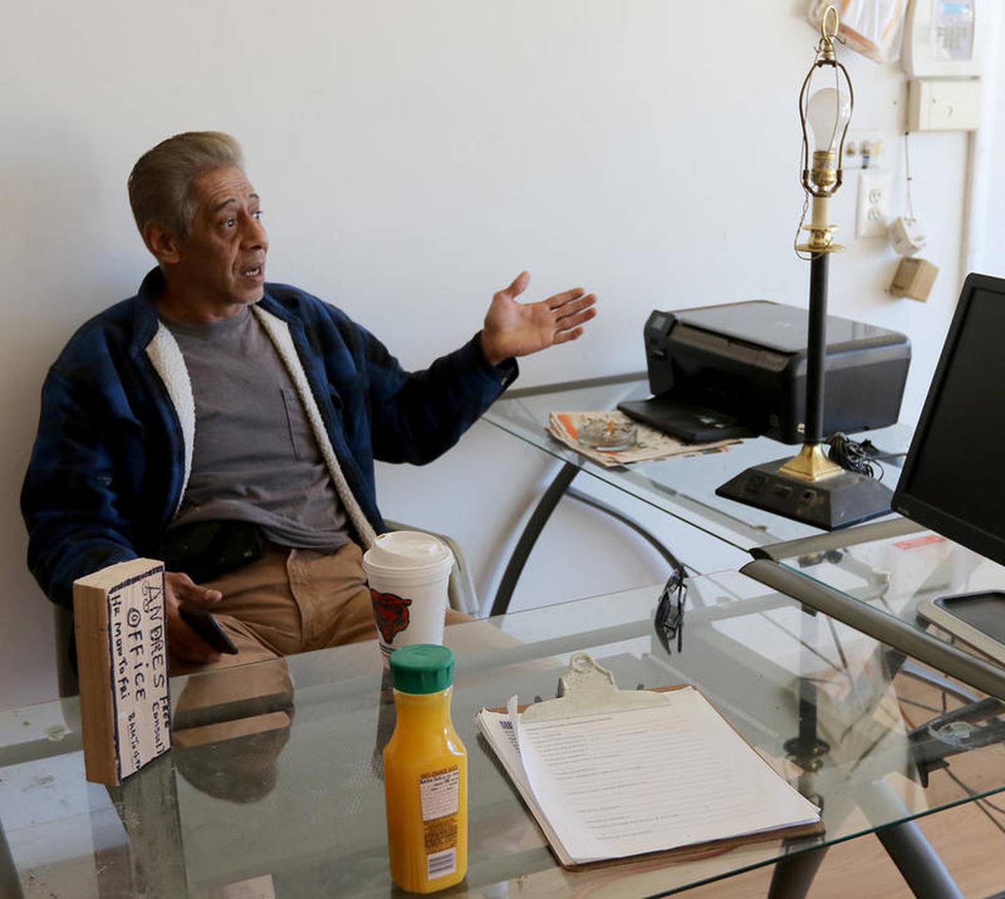 Tony Guerrero of Mir Enterprises talks Thursday about the vacant businesses along Route 14 in Fox River Grove. The city is considering using eminent domain to acquire the properties. (Matthew Apgar)