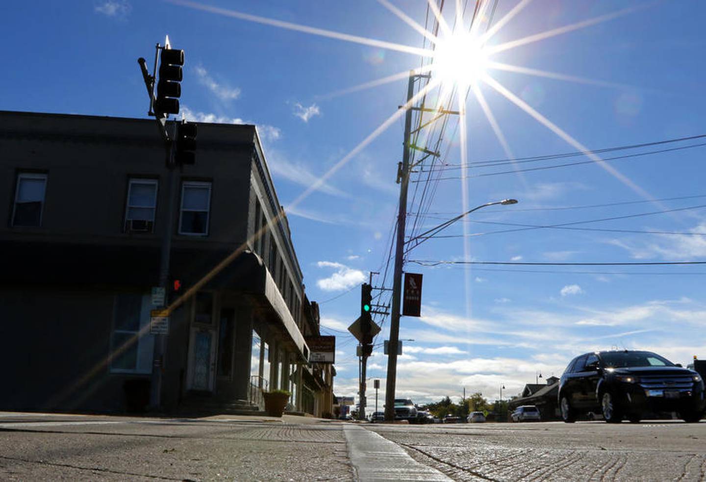 Cars drive past vacant businesses Thursday along Route 14 in Fox River Grove. The village is considering using eminent domain to acquire the properties. (Matthew Apgar)