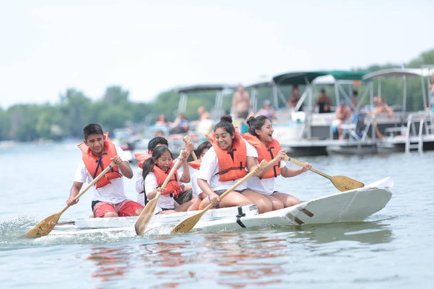 While Jacqui Hernandez, then 14, (from right) and Daniela Diaz, then 14, lead their crew, Valeria Diaz, then 10, and Eduardo Diaz, then 17, all of Crystal Lake, paddle their way to the finish line during last year's America’s Cardboard Cup Regatta at the Crystal Lake Park District’s Main Beach. (Shaw Media)