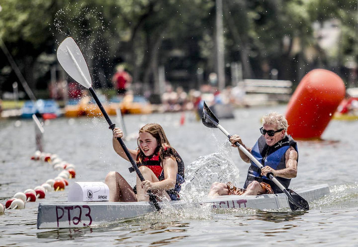 Maddie Noonan, then 13, of Wonder Lake and her father, Robert Noonan, compete the 2014 America’s Cardboard Cup Regatta at Crystal Lake Main Beach. The two are going for their fourth win in a row at this year's Regatta. (Shaw Media)