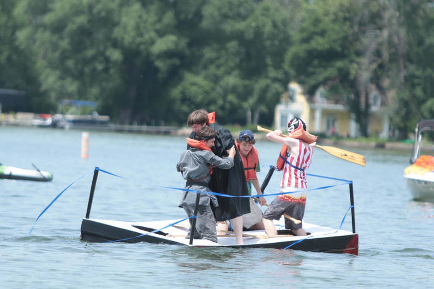 As a part of their Raw wrestling-themed boat, Ben Kaiser and James Boerschinger battle it out in front of Maxwell Blome and Dylan Batton, all of Crystal Lake, during last year's America’s Cardboard Cup Regatta at the Crystal Lake Park District’s Main Beach. (Shaw Media)