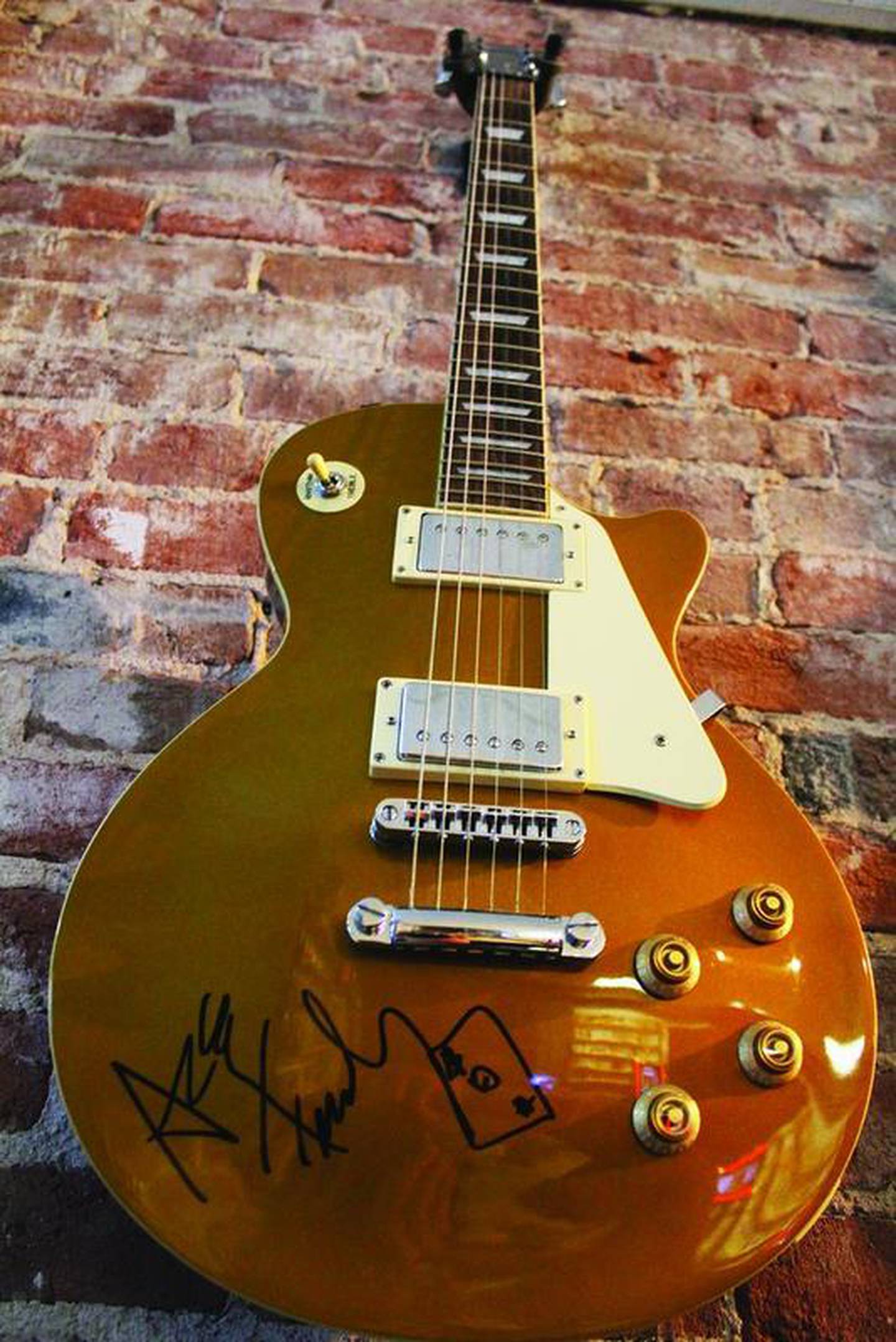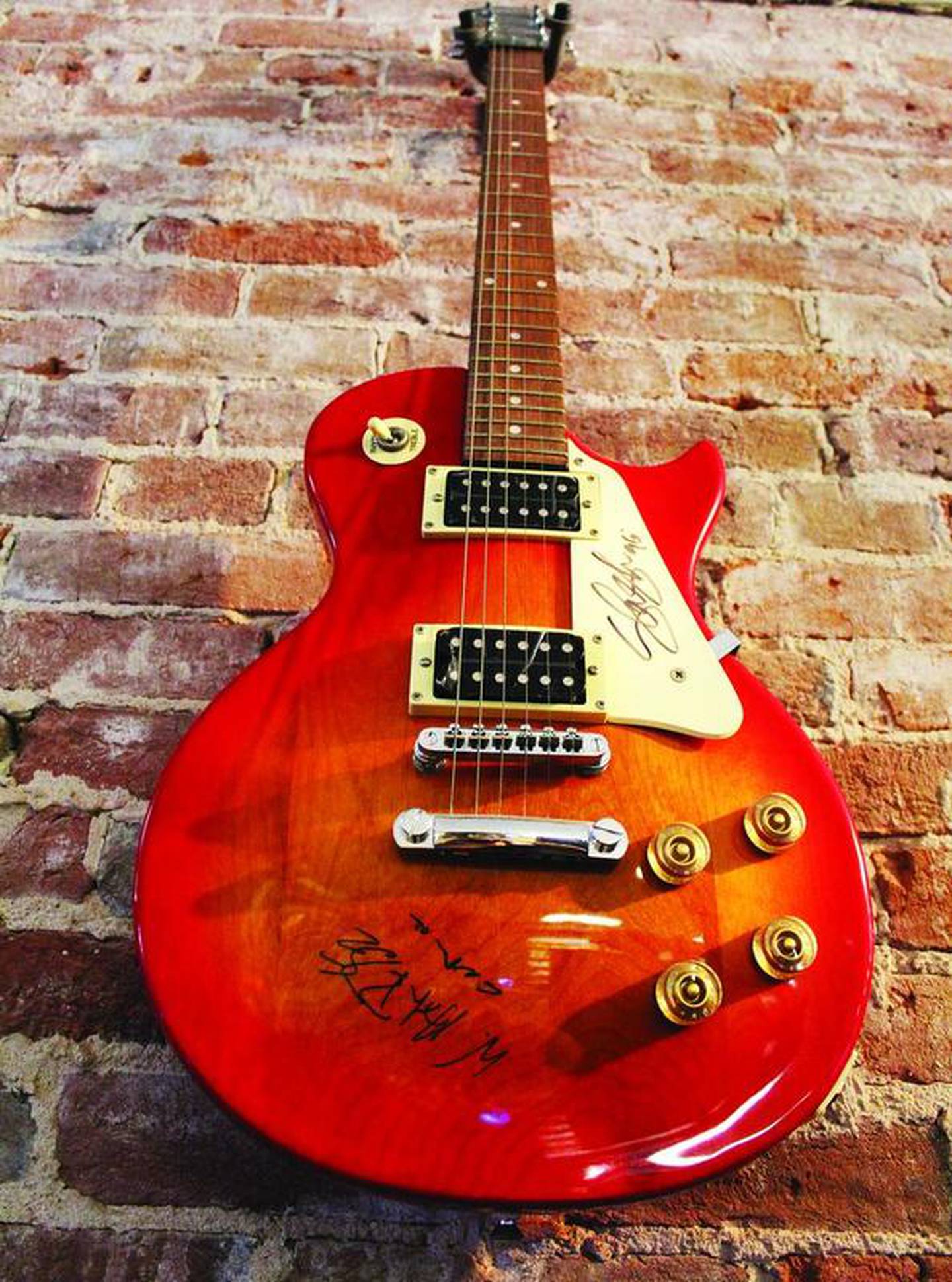 A guitar signed by Axl Rose and Slash of Guns n' Roses hangs on the wall at StoneWood Gaming. (Peter Balser)