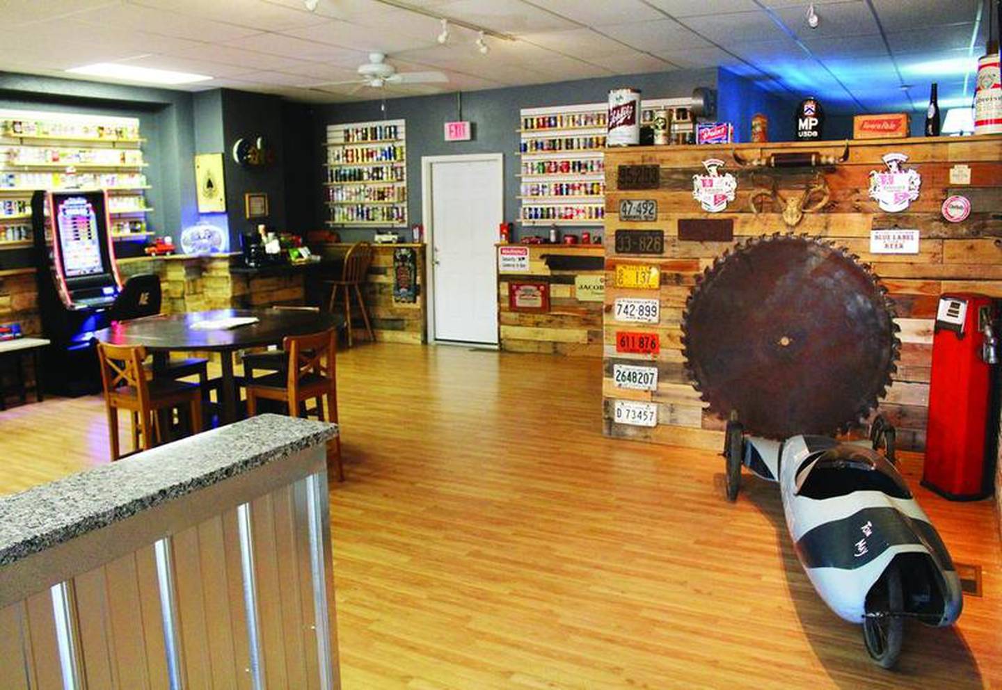 StoneWood Gaming owners Dan John and Mike Robers say they try to tell a story with the decor in their business. Old photos, beer cans, autographed guitars, vintage license plates, and soapbox derby cars that raced on Galena Avenue during the Petunia Fest in the 1980s are among the items on display. "We try to instill some local history and try to give our patrons a nice atmosphere," Robers said. (Peter Balser)
